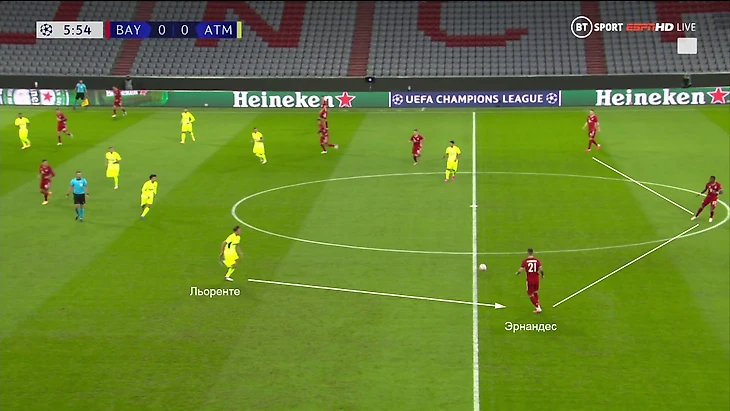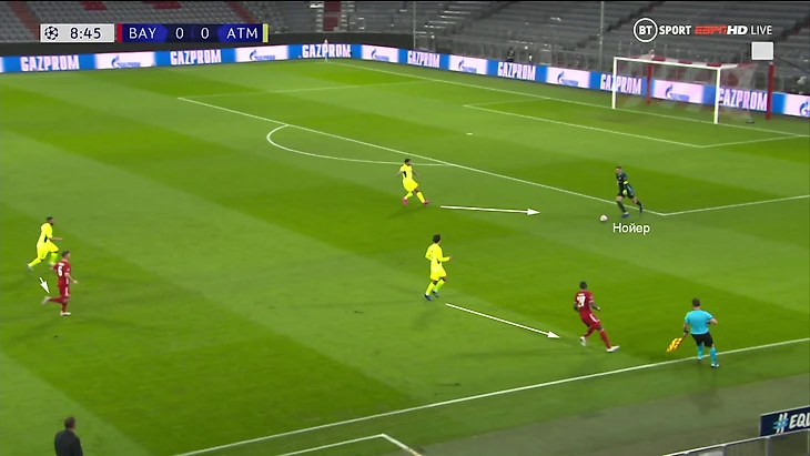 Нойер исполнил с левой – и так, что прессинг «Атлетико» мигом уничтожен (нужно смещаться на другую сторону поля, но не успеют), а партнер получает максимум времени на обработку и развитие атаки:
