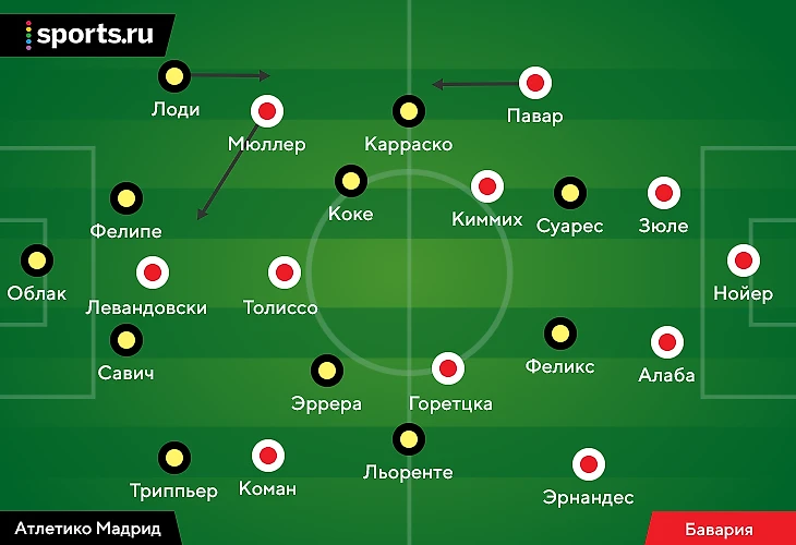3. Диего Симеоне выставил максимально ожидаемое сочетание в атаке и защите. В полузащите настолько основного варианта просто нет (особенно с учетом травмы Сауля и потери Томаса Парти). Чоло использовал простую стратегию: в последнем туре против «Сельты» сыграли те, кого он считает менее основными (Лемар, Корреа, Торрейра), а на «Баварию» свежими вышли те, к кому сейчас больше доверия (Льоренте, Карраско, Эррера). Разумеется, постоянным элементом был капитан Коке – он железный игрок старта.