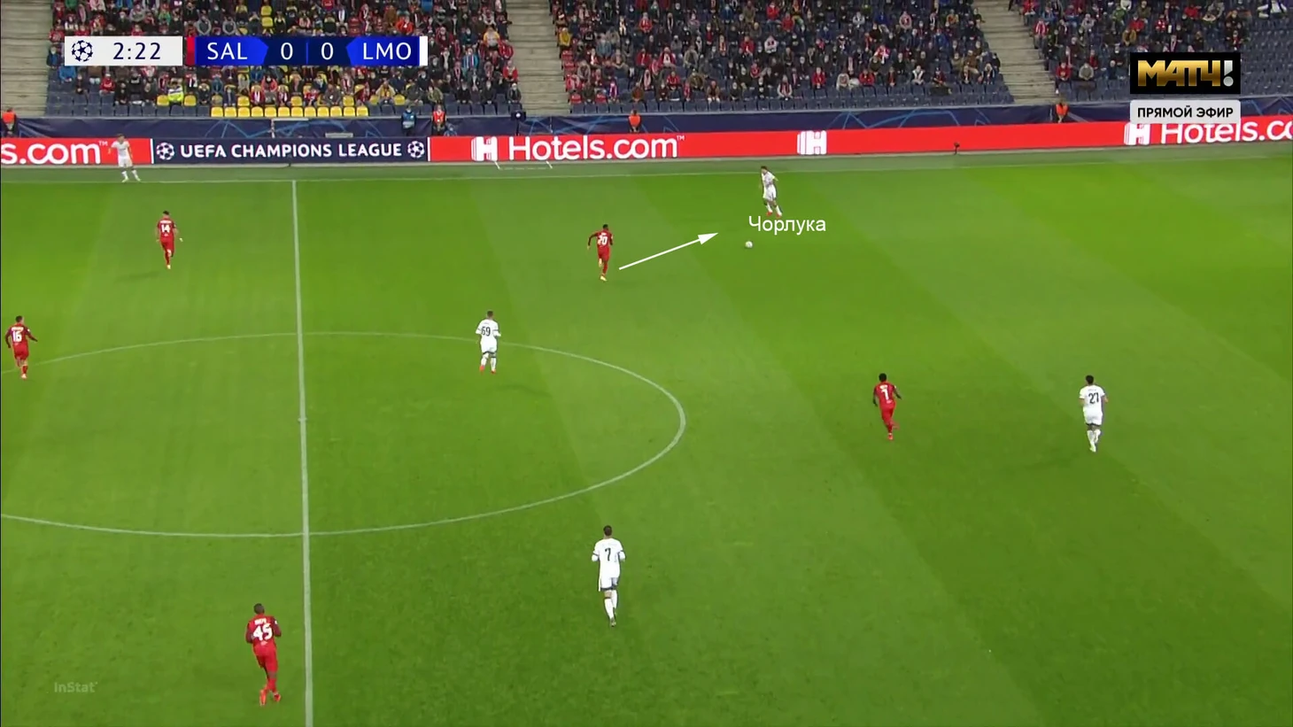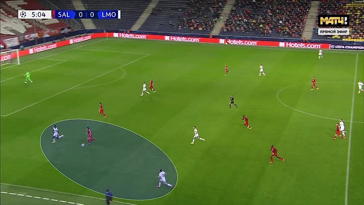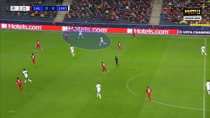 В этом контексте очень интересен матч против «РБ Зальцбурга». В первом тайме «Локо» использовал очень хороший прием (с поправкой на особенности соперника). Методология была такой же – выманить в прессинг и пройти его контролируемой дальней передачей. Отличались детали: например, «Зальцбург» не так высоко начинал давление, а «Локо» требовалось больше коротких передач перед ключевой дальней.