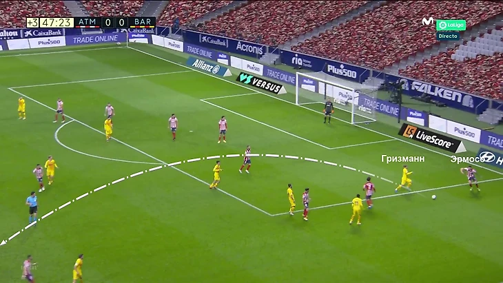 Два раза на удар выводили Лангле. Вторая попытка получилась очень опасной. Оба раза «Барса» разыгрывала коротко, делала несколько передач, дожидалась, пока защитники «Атлетико» начнут выдвигаться, а потом доставляла мяч на дальнюю штангу, куда набегал Лангле.