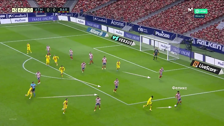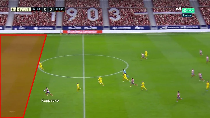 Позиция Роберто ближе к центру также часто отвлекала Сауля (или Эрмосо, если Сауль был далеко), не позволяя ему более четко помогать Карраско против Дембеле. «Барса» умышленно создавала эту изоляцию. Несколько раз это приводило к перспективным ситуациям – Усман действительно здорово переигрывал оппонента, а вот дальше было по-разному.