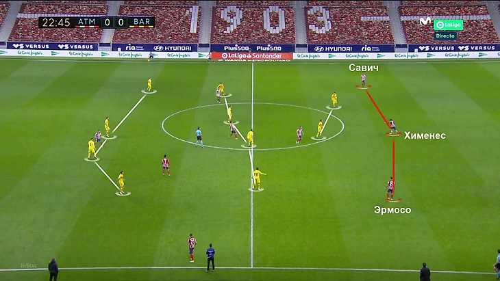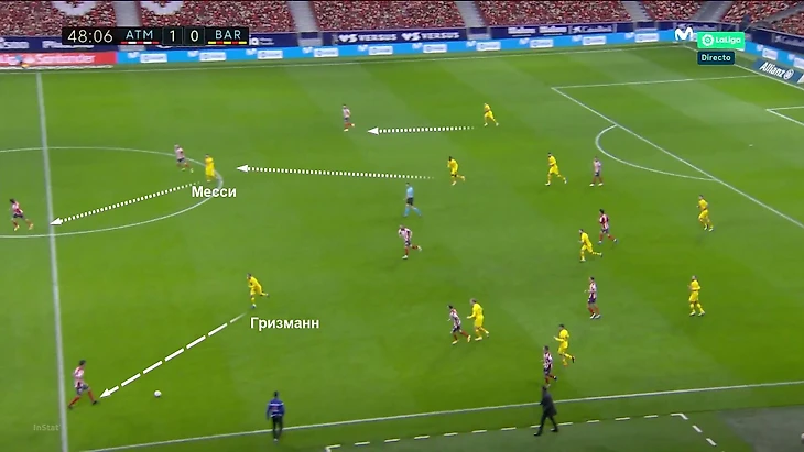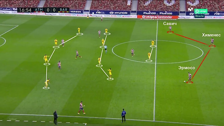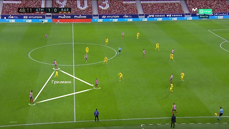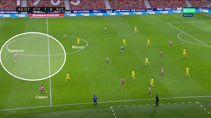 Но он не получил поддержки от Месси (а команда по цепочке поддержала бы его). Савич просто отпасовал свободному Хименесу, а одинокий Гризманн оказался в центре треугольника из игроков «Атлетико»:
