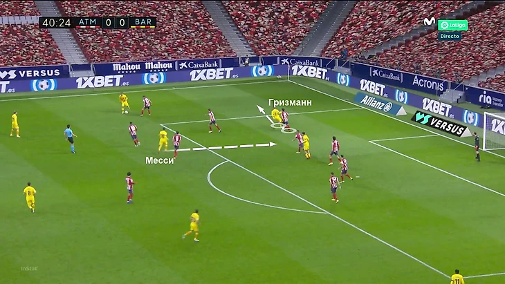 В заключительной стадии Антуан вернулся в штрафную и сделал рывок, который откроет Месси зону для врывания из глубины: