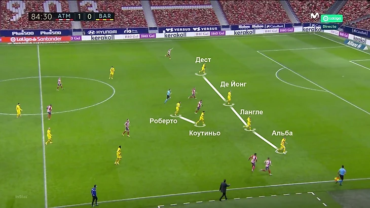 По-настоящему расшатали игру изменения Кумана. Сначала вынужденное перестроение – из-за травмы Жерара Пике в центре защиты снова пришлось сыграть Френки Де Йонгу. А потом умышленный ход ва-банк – все атакующие игроки на поле, схема 4-2-4 с Филиппе Коутиньо в опорной зоне (ну и Де Йонгом по-прежнему в центре защиты).