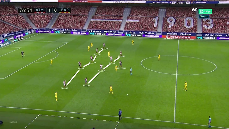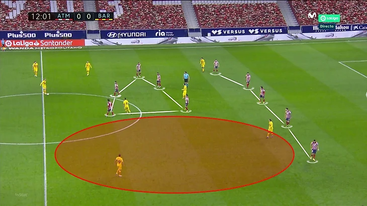 Стратегия была рискованной, но вполне осмысленной. Чтобы накрыть соперника в таком сценарии, «Барселоне» нужно было поработать (следовательно, стянуть в давление больше футболистов; следовательно, если давление удалось преодолеть, «Атлетико» получал отличные возможности в атаке).