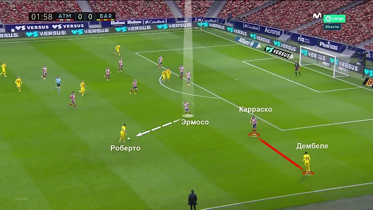 «Барса» могла выбирать, на какой край направлять атаки. Как правило, выбирали фланг Дембеле. Там умышленно создавались эпизоды 1-в-1 с дуэлью Дембеле-Карраско. Роберто умышленно уходил поближе к центру, а за ширину в атаке отвечал именно француз: