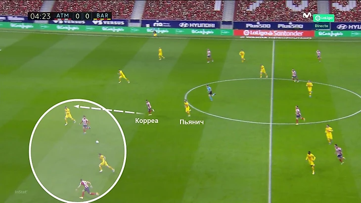 Команда Симеоне прошла давление и перевела мяч на более свободный фланг. Здесь 2-в-2 плюс набегающий Корреа, за которым не успевает Пьянич: