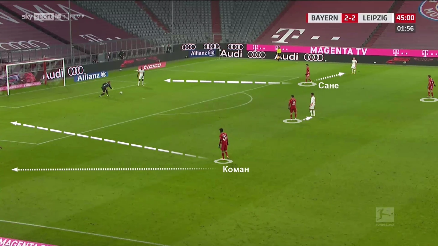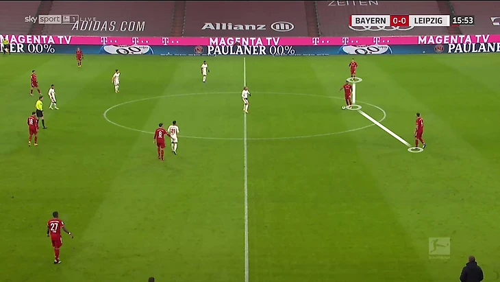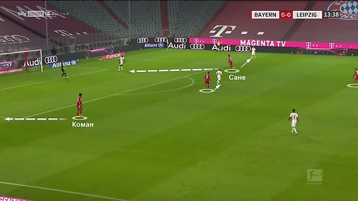 Здесь использовался самый частый вариант. Вингеры Коман и Сане играют между центральными и крайними защитниками. Левандовски – по опорнику (с перспективой выдвинуться на вратаря), а Мюллер читает действия соперника: