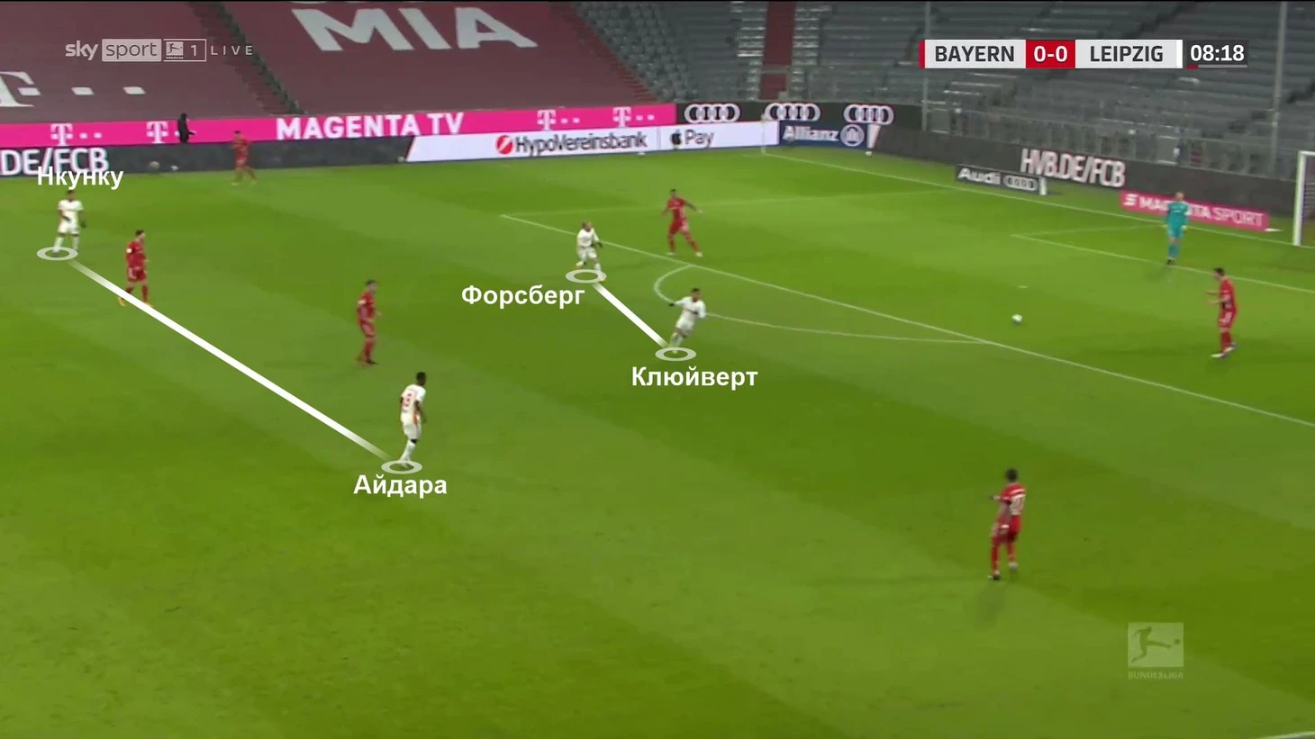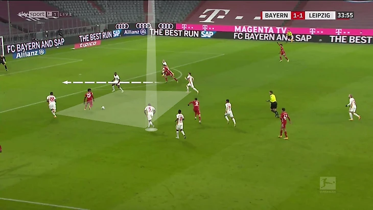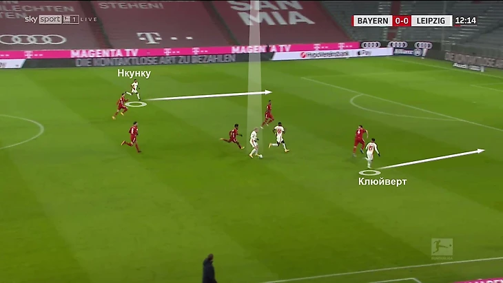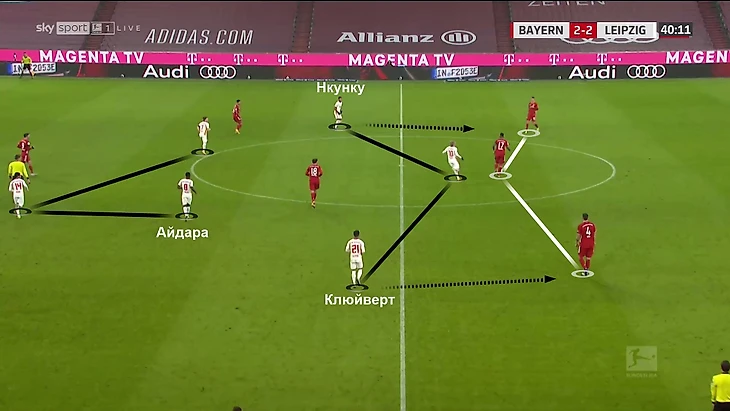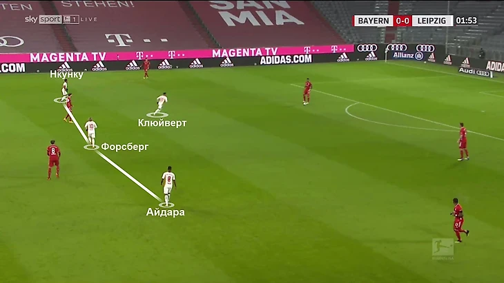 5. «Лейпциг» был готов к такой трансформации «Баварии». При создании тройки они переставали давить привычным образом, а переходили на прессинг с тройкой Нкунку-Форсберг-Клюйверт в 4-3-3: