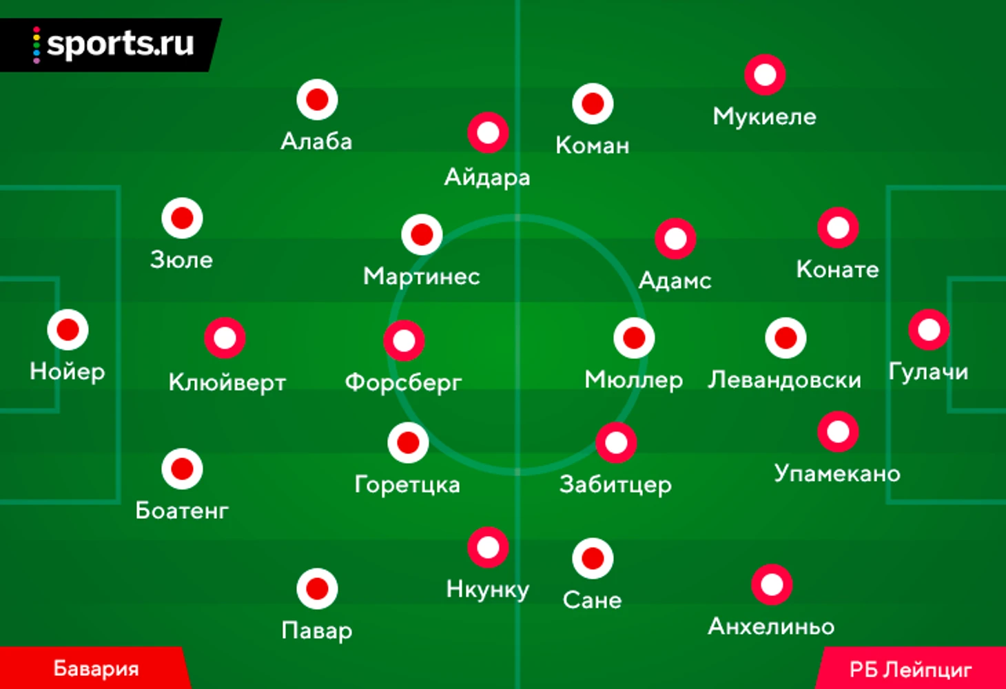 Юлиан Нагельсманн намного чаще переключается между разными формациями (порой даже в рамках одного матча). В этот раз он выбрал нечто среднее между 4-3-3 и 4-2-3-1 вообще без чистых форвардов. В случае «Лейпцига» важнее была интерпретация идеи, а не количество игроков в линиях – схема была гибкой, но здорово била по слабым сторонам «Баварии» (разберем это ниже).