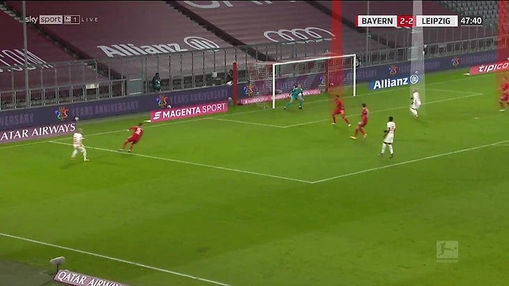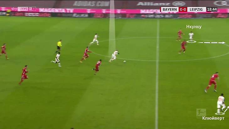 От успешности этих выдвижений в плане «Лейпцига» много зависело. Задача минимум – не дать развернуться (или развернуть атаку). Максимум – напрямую отобрать мяч. Слишком часто Упамекано с задачей не справлялся. Один из примеров – второй гол. Здесь Дайо пошел до конца за Левандовским на правую часть поля (вообще он играет ближе к левому краю, но тут без передачи играл до конца с нападающим).