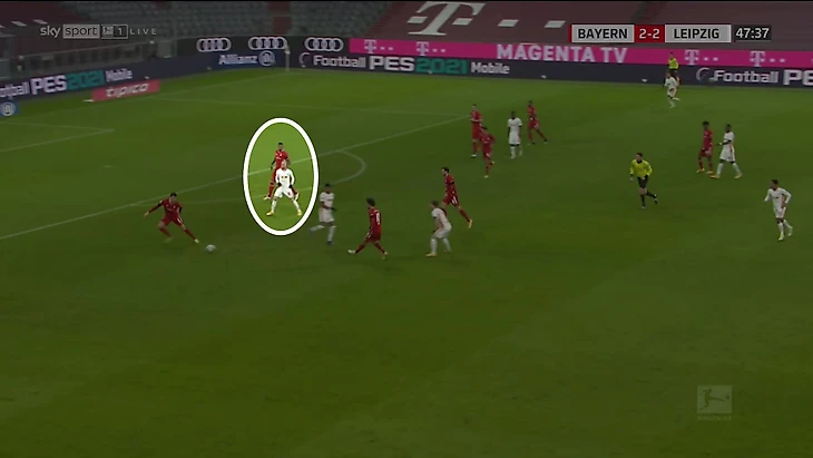 На практике это привело к удобным условиям для «Баварии». Во-первых, теперь они играли против соперника, который вжимается в штрафную. Во-вторых, из-за перестроений одним из центрдефов оказался Адамс, а латераля справа играл Нкунку. Именно эту новообразованную зону (и нехватку связей в ней) в голе на 3:3 использовал Томас Мюллер.