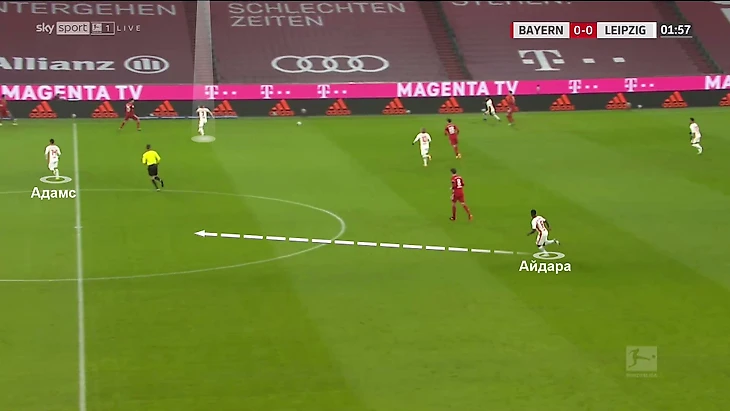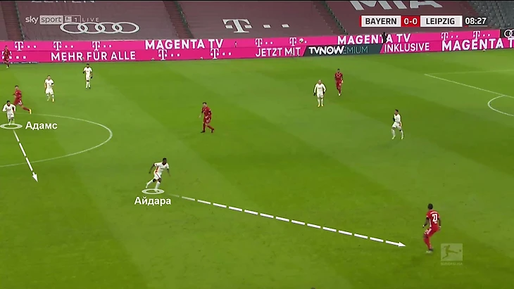Задачей пары было направить атаку на один из флангов. Далее происходило смещение – Тайлер Адамс контролирует опорную зону с помощью Айдары (который бежит с противоположного фланга), а Марсель Забитцер зажимает соперника на фланге: