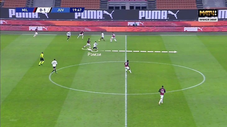 Самая частая проблема «Милана» в таком сценарии – зона между фланговым и центральным защитником. Центральные защитники «Милана» играют строго по штрафной, а эту зону в стандартной картине прикрывают опорники. Вчера они не успевали – «Юве» слишком быстро двигался мяч (плюс Рэмзи с Рабье отвлекали их).