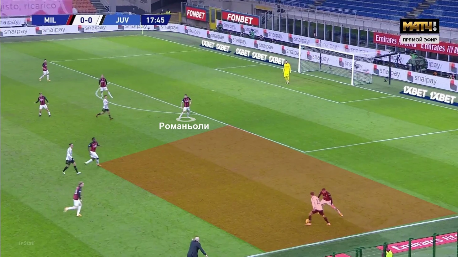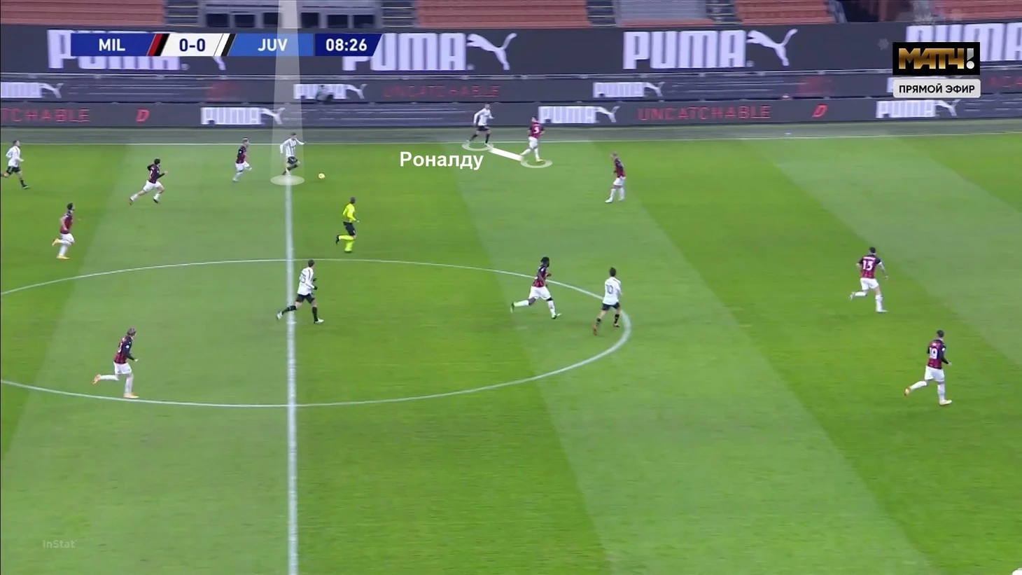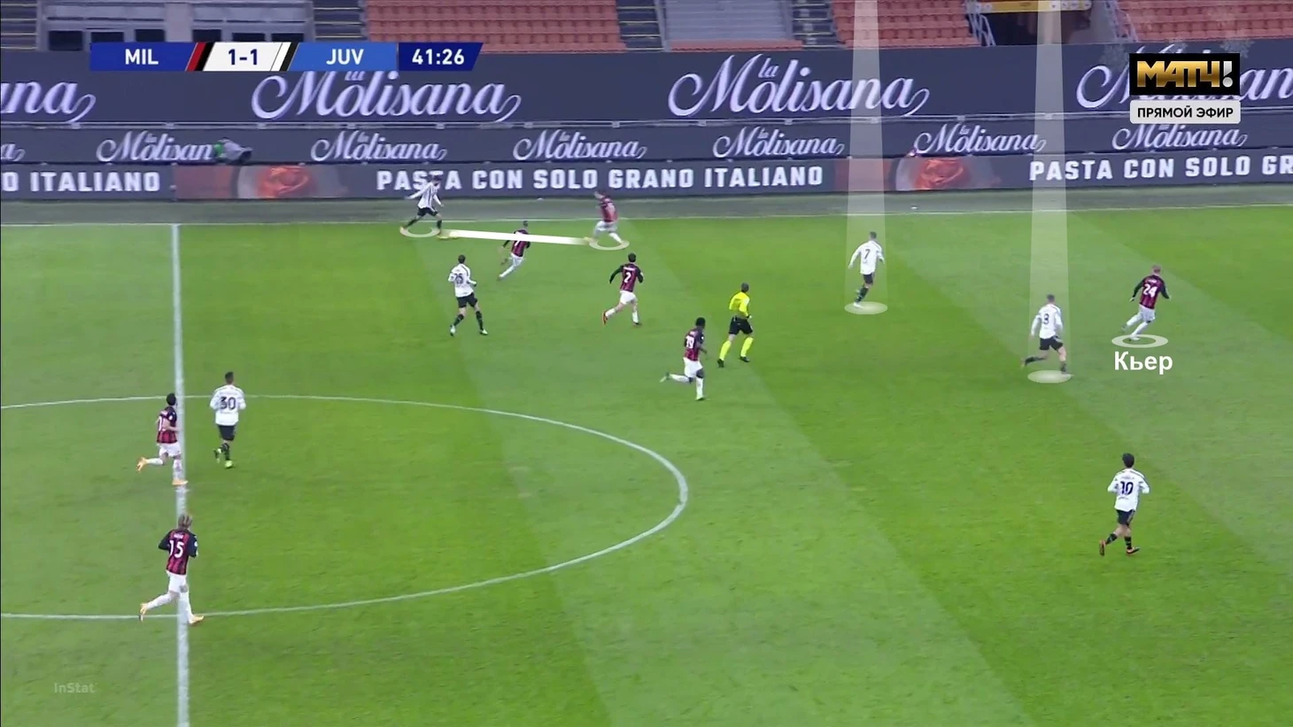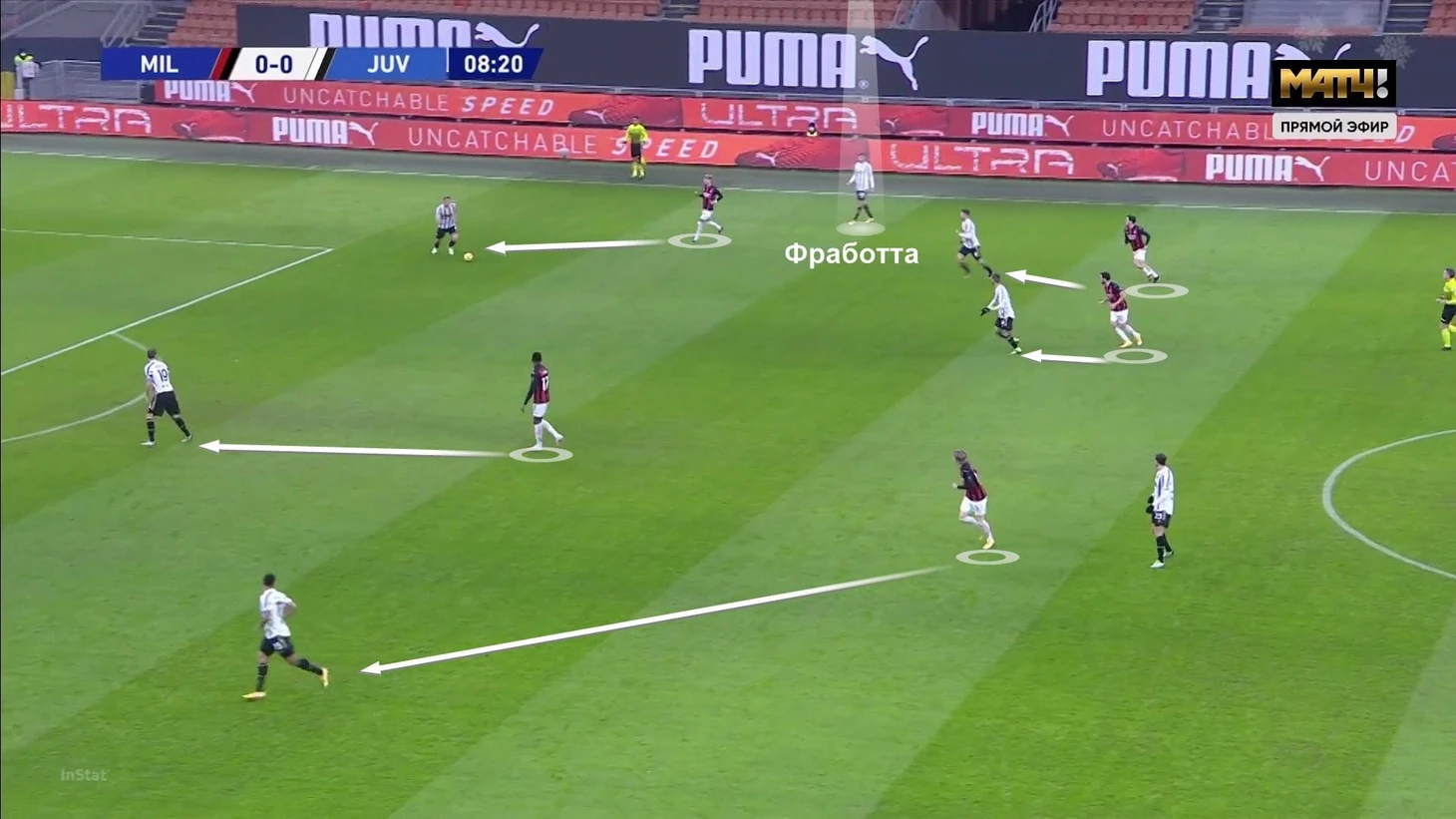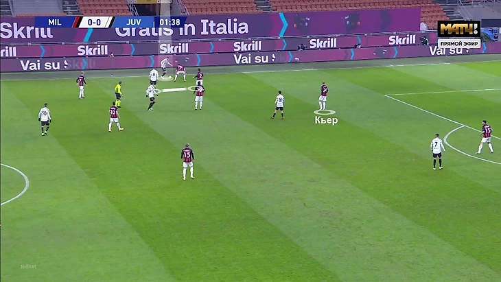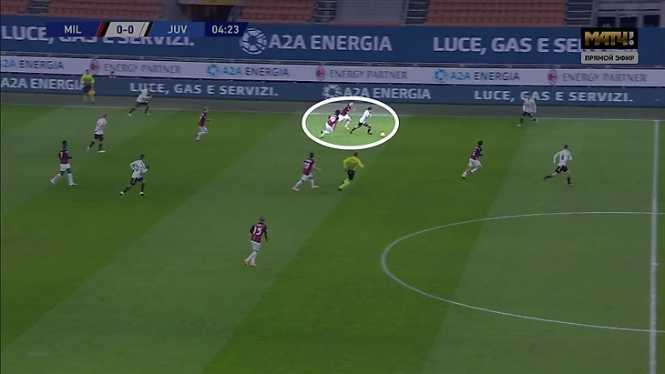 В зоне мяча персоналки были максимально плотными, остальная часть команды пыталась поддерживать схему, но все равно оглядывалась на прямого оппонента в составе «Юве». То есть при переводе мяча в другую зону аналогичная плотность создавалась и там. Разумеется, такое давление требует огромного объема работы и интенсивности. На стартовом отрезке у «Милана» все это было.