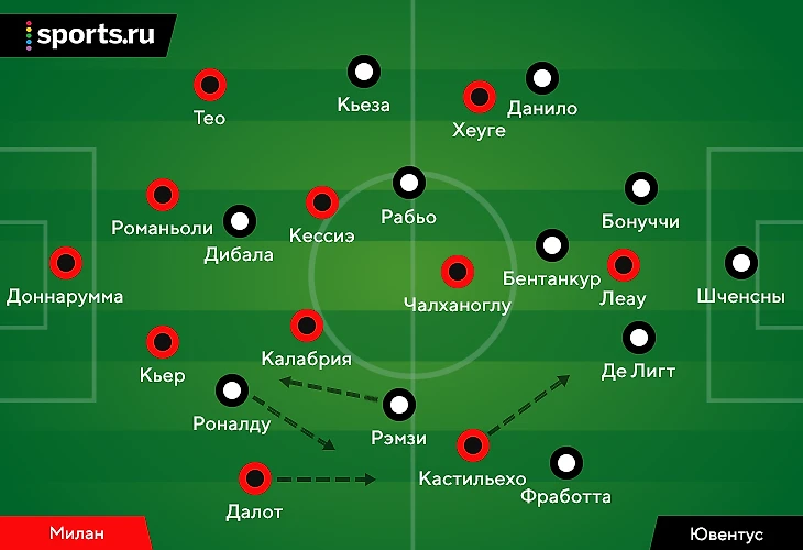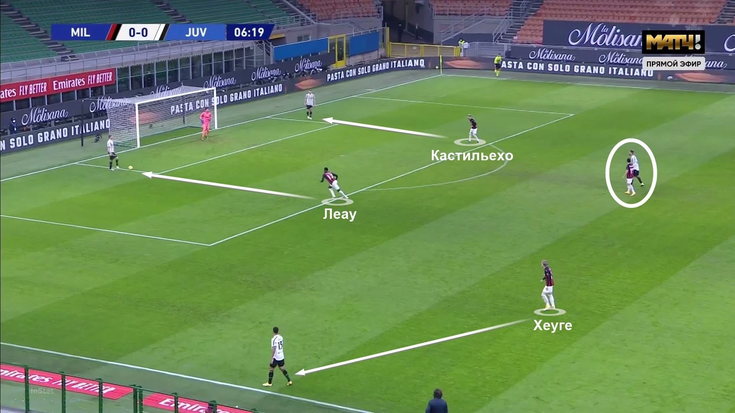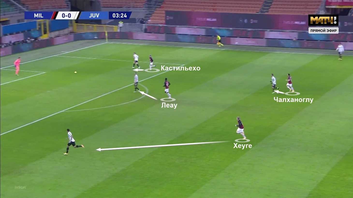 «Милан» использовал персональные ориентировки. Когда «Юве» создавал тройку (с Данило), было вообще удобно – Хеуге, Леау и Кастильехо накрывали центральных защитников, а Чалханоглу играл по Бентанкуру.