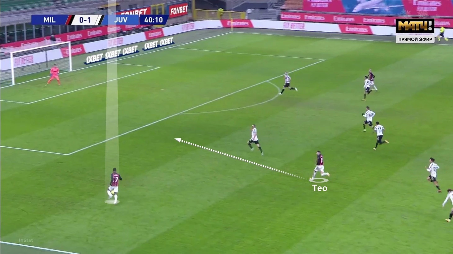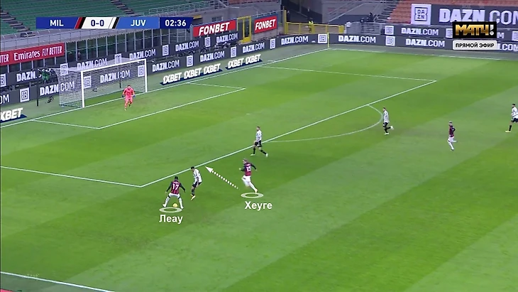 Общий элемент эпизодов – позиция Леау + отвлекающий рывок от партнера, который создает ему больше свободы и времени на поиск решения. Обычно рывок делал Хеуге (левый вингер), но в голе его организовал Тео Эрнандес. Француз провел не лучший матч в обороне, но это действие нужно отдельно отметить – оно сильно помогло в голевой атаке и не было очевидным (Тео пришлось именно рвануть, чтобы помочь Леау, а не просто двигаться со скоростью атаки).