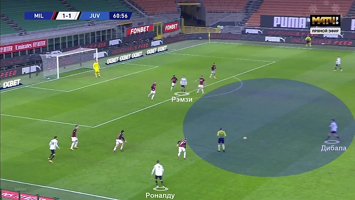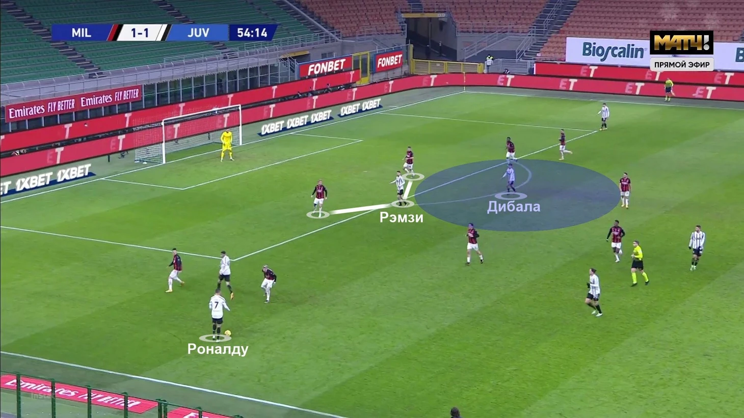 Похожим образом «Юве» выстроился и перед победным голом. Атака развивалась быстро, но Рэмзи все равно заполнил штрафную (и рывком отвлек Кессиэ, чем создал Дибале больше простора), Роналду слева, а Пауло в опорной: