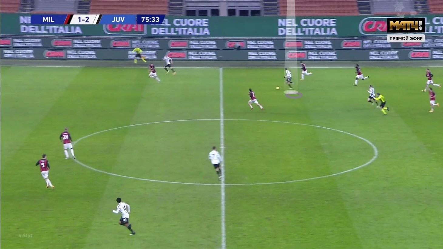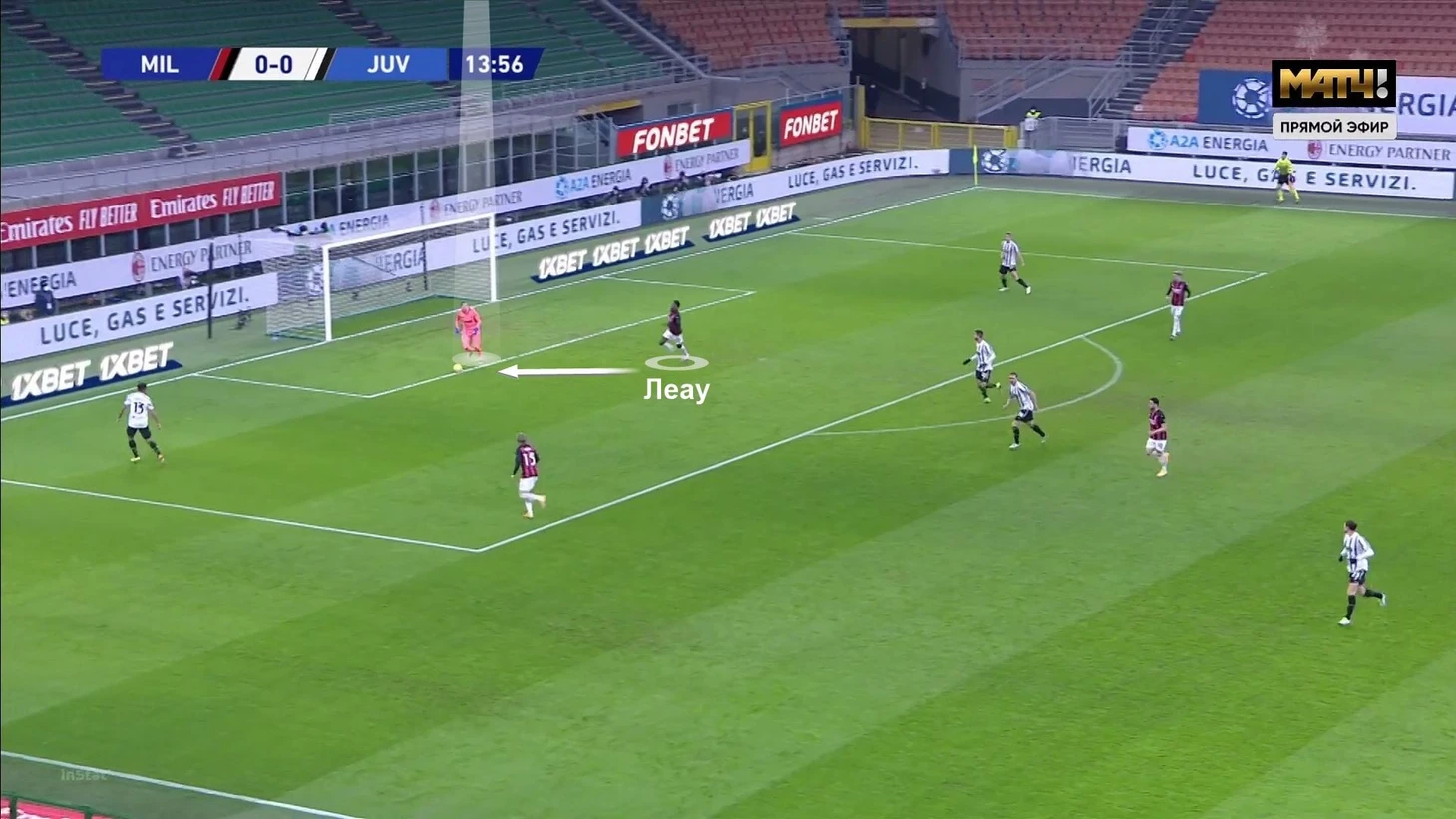 8. Еще один источник угрозы в составе «Милана» – быстрая доставка мяча на Леау, который пытался ловить высокую защиту «Юве» на левом фланге. Ярче всего это проявилось в голе, но смещения Рафаэла были регулярными – и «Милан» старался быстро его находить: