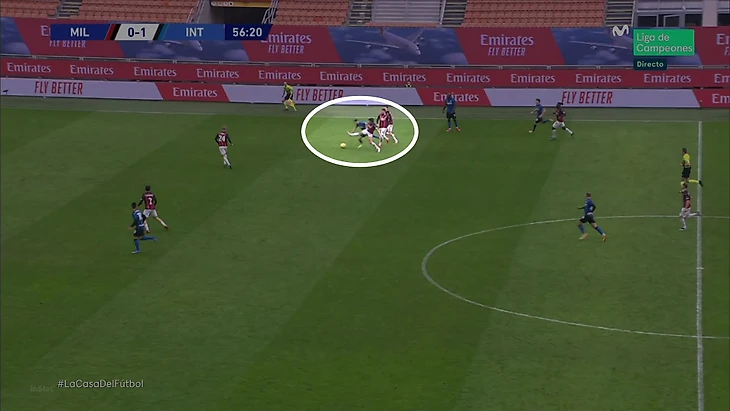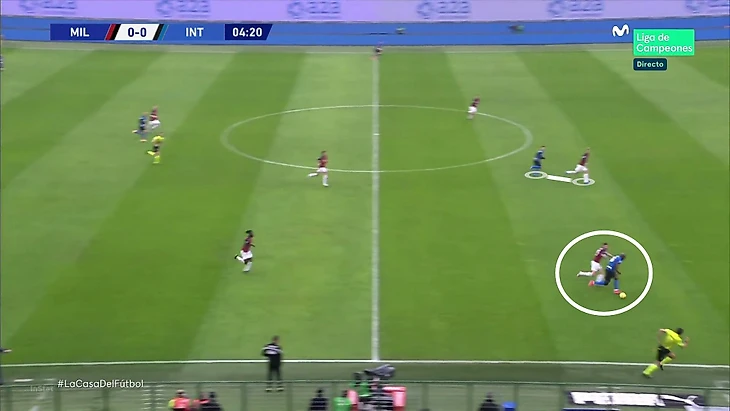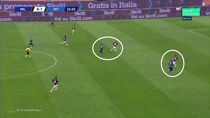 Ситуации такого же плана «Интер» провоцировал, выманивая соперника в прессинг. Здесь суть была той же (свести игру к индивидуальным дуэлям, где Лукаку и Лаутаро порвут), но природа моментов отличалась – они не были заготовленными, а рождались естественным образом сразу после отбора. «Интер» получал еще один источник угрозы.