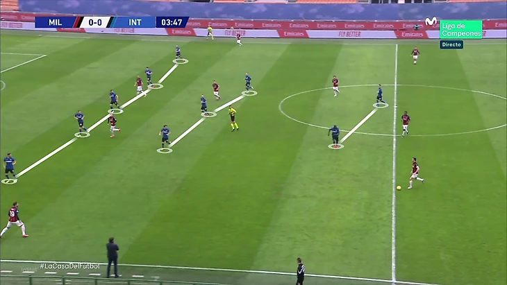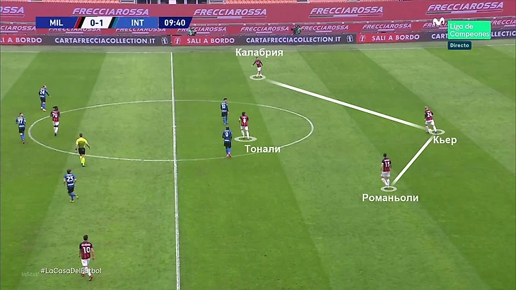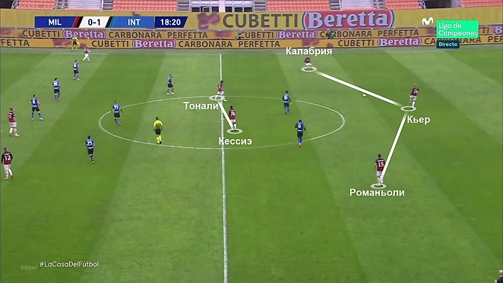 Эта традиционная схема, которой «Милан» проходит чужой прессинг. Но при практически полном отсутствии давления со стороны «Интера» такое расположение было неуместным. «Милану» не хватало футболистов, чтобы насытить все зоны на чужой половине.