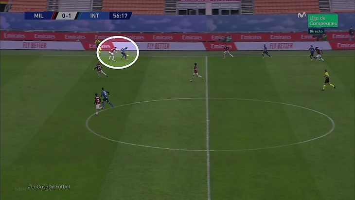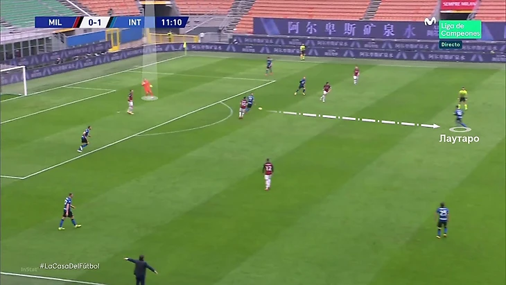 7. Еще одно следствие такого сценария – «Интер» получал шансы для контратак, в которых Лаутаро и Лукаку регулярно оказывались против Кьера и Романьоли на пространстве (заведомо невыгодная ситуация для защитников, а тут еще пара форвардов пугающе мощная).