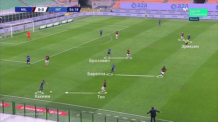 Второй вариант предполагал прохождение давления через фланги. В таком сценарии и Эриксен, и Барелла опускались, чтобы выманить побольше соперников в давление. Хакими продвигал мяч на нападающих, но только после выдвижения в прессинг Тео, чтобы в зоне мяча возникали персональные дуэли – Лукаку-Романьоли и Лаутаро-Кьер.