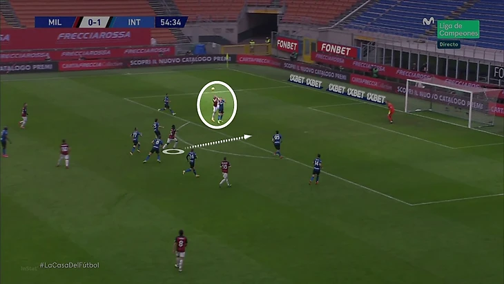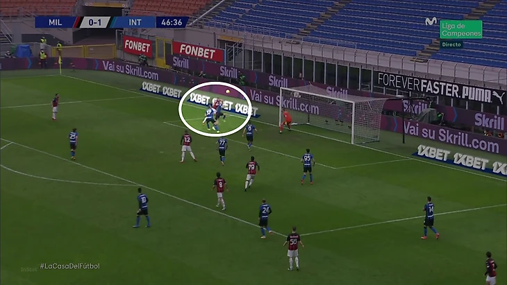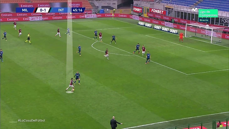 6. Мы получили картину, в которой «Милан» стерильно перекатывает мяч между оборонительными игроками (или на флангах), а «Интер» не форсирует отборы. Осознанное решение Конте сыграть без прессинга наложилось на слишком осторожные схемы розыгрыша «Милана» в первом тайме.