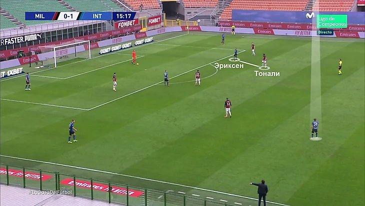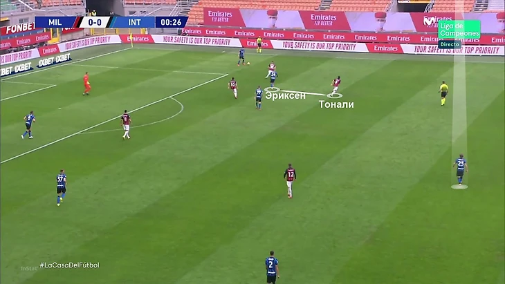 У «Интера» было два ключевых приема уничтожения прессинга. Первый – растянуть полузащиту в центральной зоне. Эриксен опускается максимально глубоко и уводит за собой Тонали, а Барелла остается повыше (и даже получает больше свободы, так как Кессиэ перестает играть по нему и на фоне выдвижения Тонали уходит страховать зону):