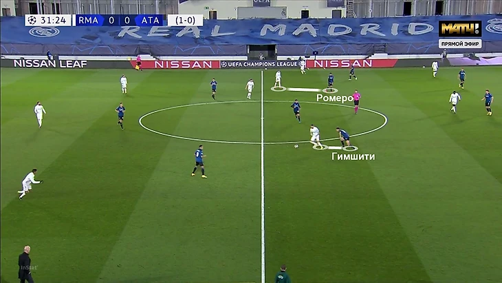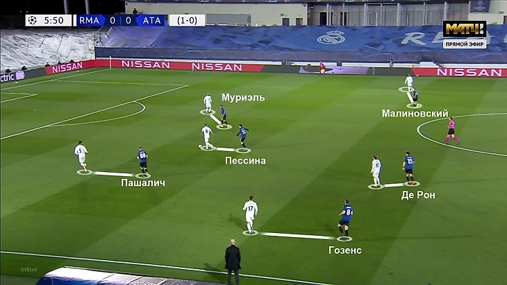 Структура сохранялась, даже когда опорникам и центральным защитникам приходилось выдвигаться в совсем нестандартные зоны. Опорники Де Рон (Модрич) и Пессина (Кроос) плюс центрдеф Гимшити (Вальверде) на чужой половине поля, а Малиновский (игрок атакующей тройки), наоборот, вне кадра, потому что его оппонент Начо поднялся повыше: