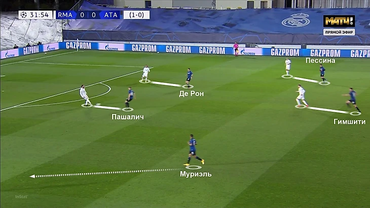 Как обычно, «Аталанта» прессинговала персонально. Здесь очень хорошо видны персональные ориентировки – позиция футболистов «Аталанты» при давлении определялась не схемой, а позицией оппонента, все варианты перекрывались персонально: