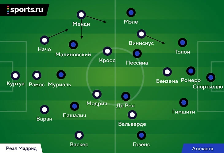 Базовая идея формулировалась примерно так: переход при владении на четверку защитников, где Начо становится левым, а Менди играет свободного игрока (его роль разберем отдельно). Внутри этой структуры игроки действовали свободно, но старались не дублировать друг друга. Маневры «Реала» создавали самые разные тупиковые для персонального прессинга «Аталанты» ситуации.