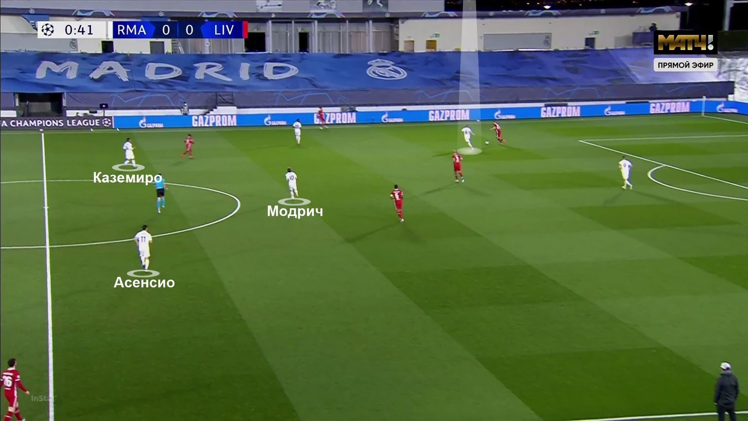 Если формулировать очень упрощенно, можно сказать, что Модрич и Кроос проделывали интеллектуальную работу в прессинге (вовремя начинали давление), а Асенсио и Винисиус – беговую (отвечали за двух оппонентов каждый, постоянно смещались). Хотя, разумеется, в прессинге все должны бегать и принимать верные решения – просто определенные акценты в ролях прослеживались. Бензема тоже отрабатывал, но в плане принятия прессинг-решений его роль была не такой широкой.