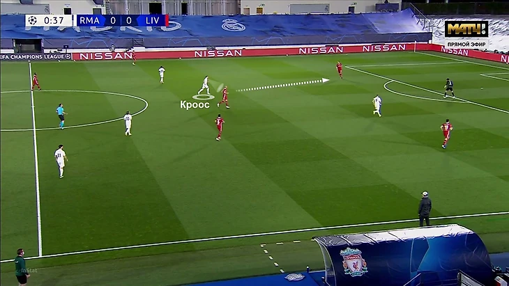 Кроос выдвигается и оказывается на одной линии с Бензема. Провоцирует дальний вынос: