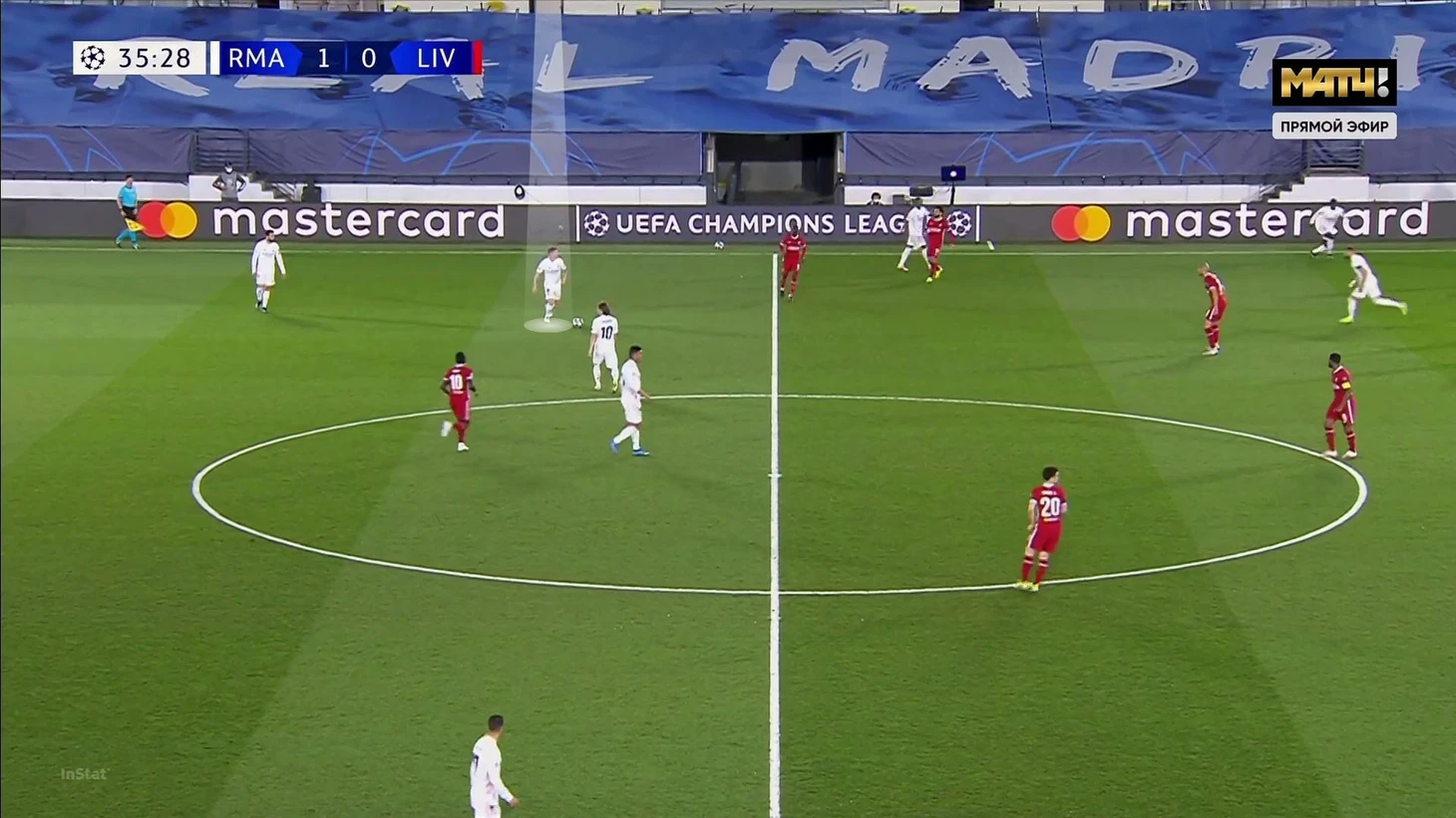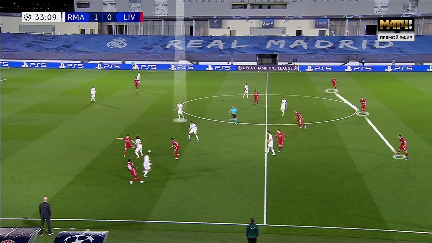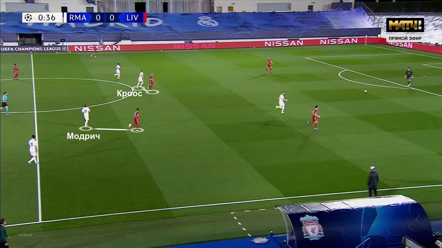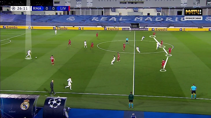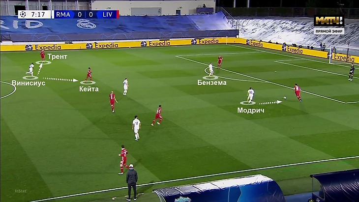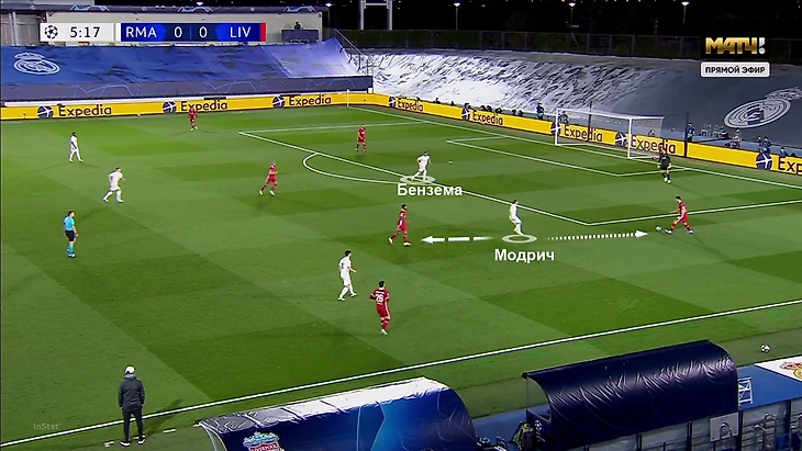 Роль вингеров «Мадрида» хорошо заметна на этом примере. Модрич выдвинулся для помощи Бензема, «Реал» в привычной схеме прессинга, а «Ливерпуль» готовит перевод: