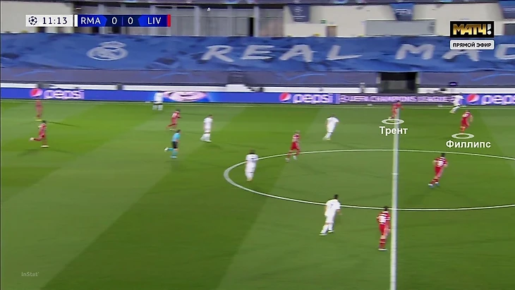7. Главным оружием Зидана в атаке стали передачи за спину в зону ТАА – Филлипса. Адресатом часто был Винисиус, поэтому велик соблазн свести все просто к дуэли Трент – Винисиус, но проблема была шире. Здесь сыграли замены и плохой прессинг «Ливерпуля» (разберем ниже), а также взаимодействия между Трентом и Филлипсом (а не один виновник).
