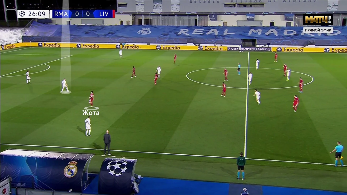 1. Зинедин Зидан выставил предсказуемый состав. Французу пришлось в последний момент реагировать на потерю Рафы Варана, которому в день матча пришел положительный тест на коронавирус. В паре с Начо вышел Эдер Милитао, а формация и детали плана не изменились.