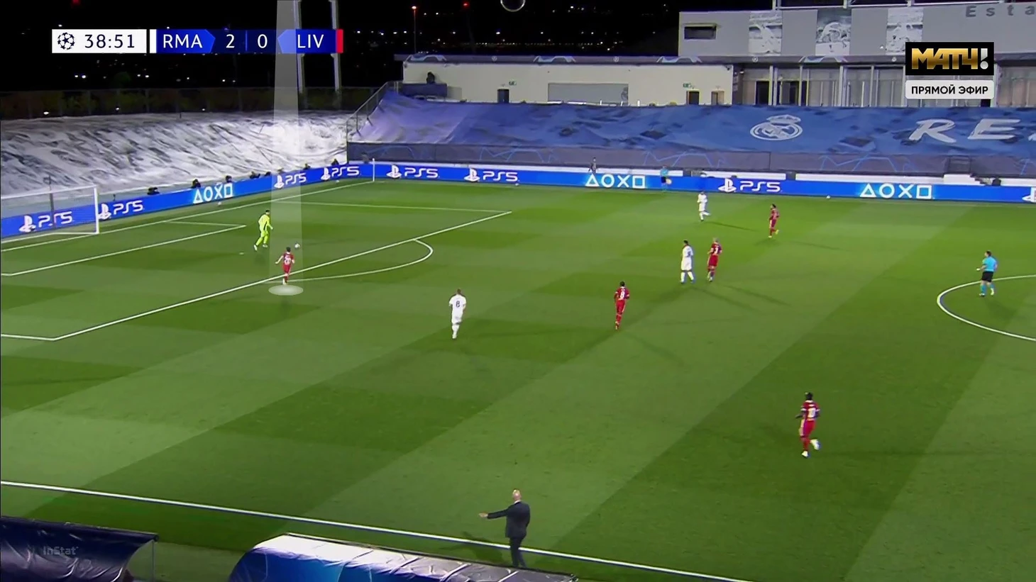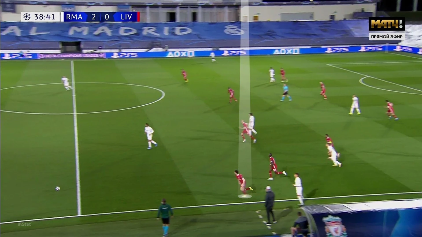 Территориальная картина первых 38 минут (до того, как стало 2:0) – хорошее отражение эффективности прессинга «Реала». 31% действий на трети «Ливерпуля» против всего 21% на трети «Реала». Еще более впечатляющий факт: «Ливерпуль» закончил тайм с 0 ударов в сторону ворот. То есть «Мадрид» тотально ограничил соперника, даже особенно не полагаясь на вмешательства центральных защитников (пара Милитао – Начо вызывала опасения, но план Зидана сократил объем их работы).