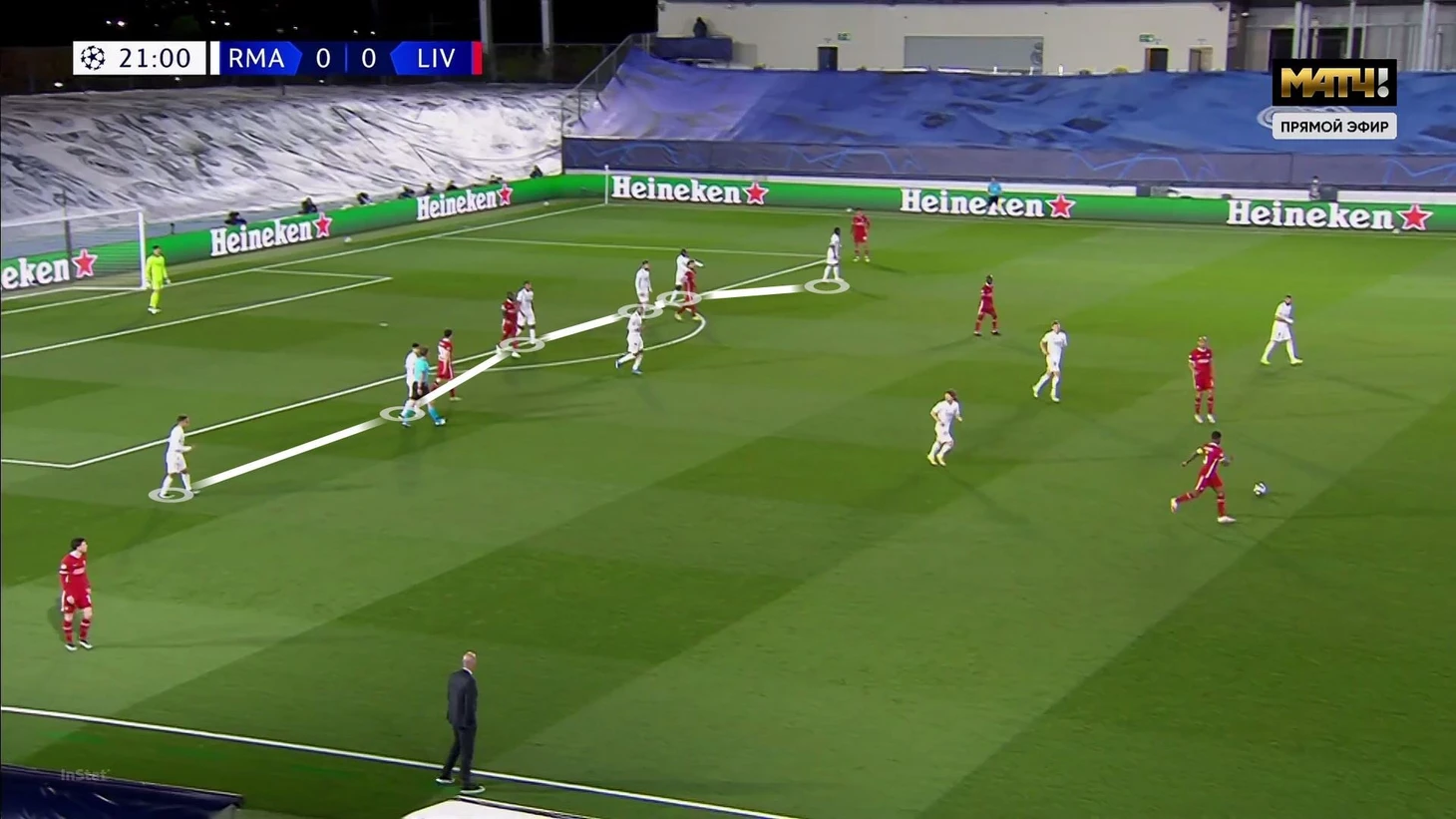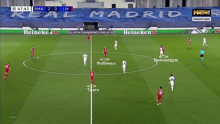 Давление поддерживается всей командой. Модрич сместился поближе к Фабиньо, Асенсио – к Вейналдуму, Каземиро поднялся за Наби Кейта. Свободен лишь дальний фланг. Зидан умышленно жертвовал им, чтобы создать плотность в зоне мяча.