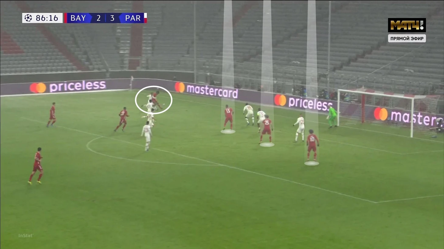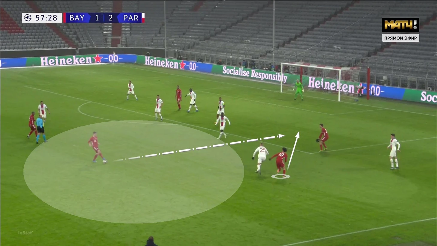 Две ключевые детали – умение Киммиха быстро направлять атаки (в миллионный раз повторяюсь, но это правда дико важно) и особенно фанатичное насыщение штрафной. В этом примере резкий рывок в штрафную сделал правый защитник Павар: