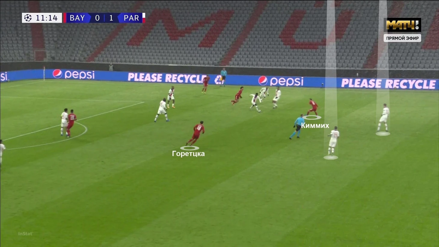 В этом моменте «Бавария» играла в меньшинстве (Горетцке оказывали помощь), Киммиха это не волнует – агрессивно идет прессинговать в зону, где у «ПСЖ» явный перевес: