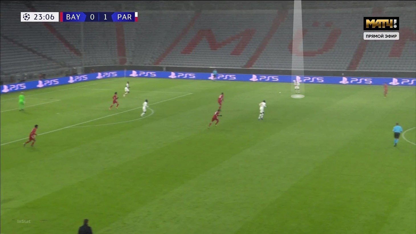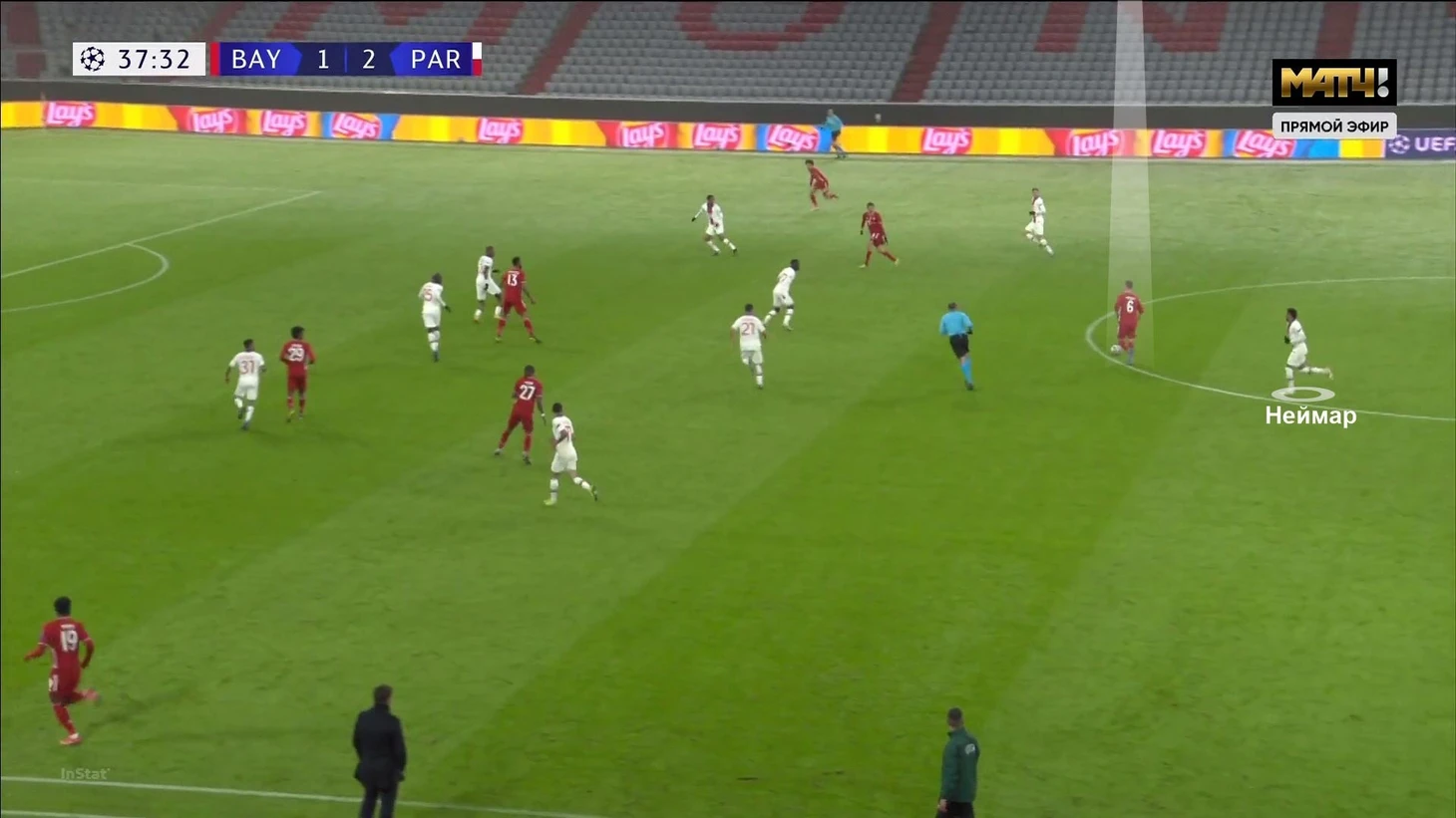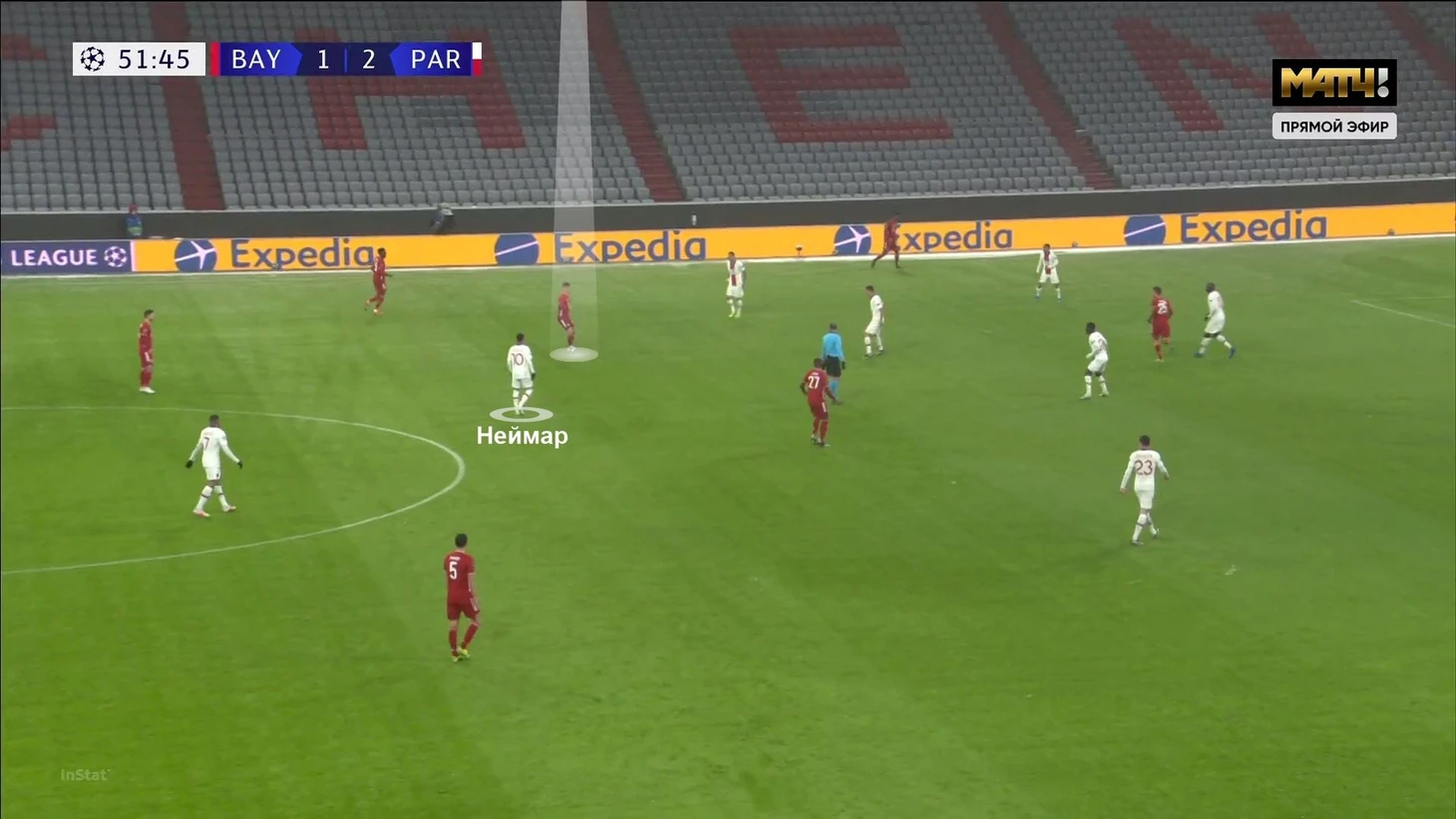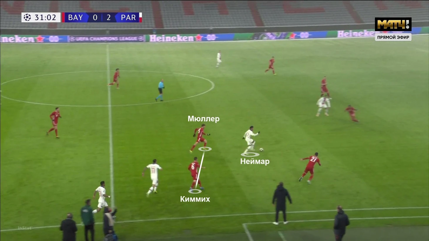 Парой передач его отрезают, а Неймар оказывается с мячом между линиями. Опорники по эпизоду (Киммих и Мюллер) уже у него за спиной – вынуждены догонять, а не встречать: