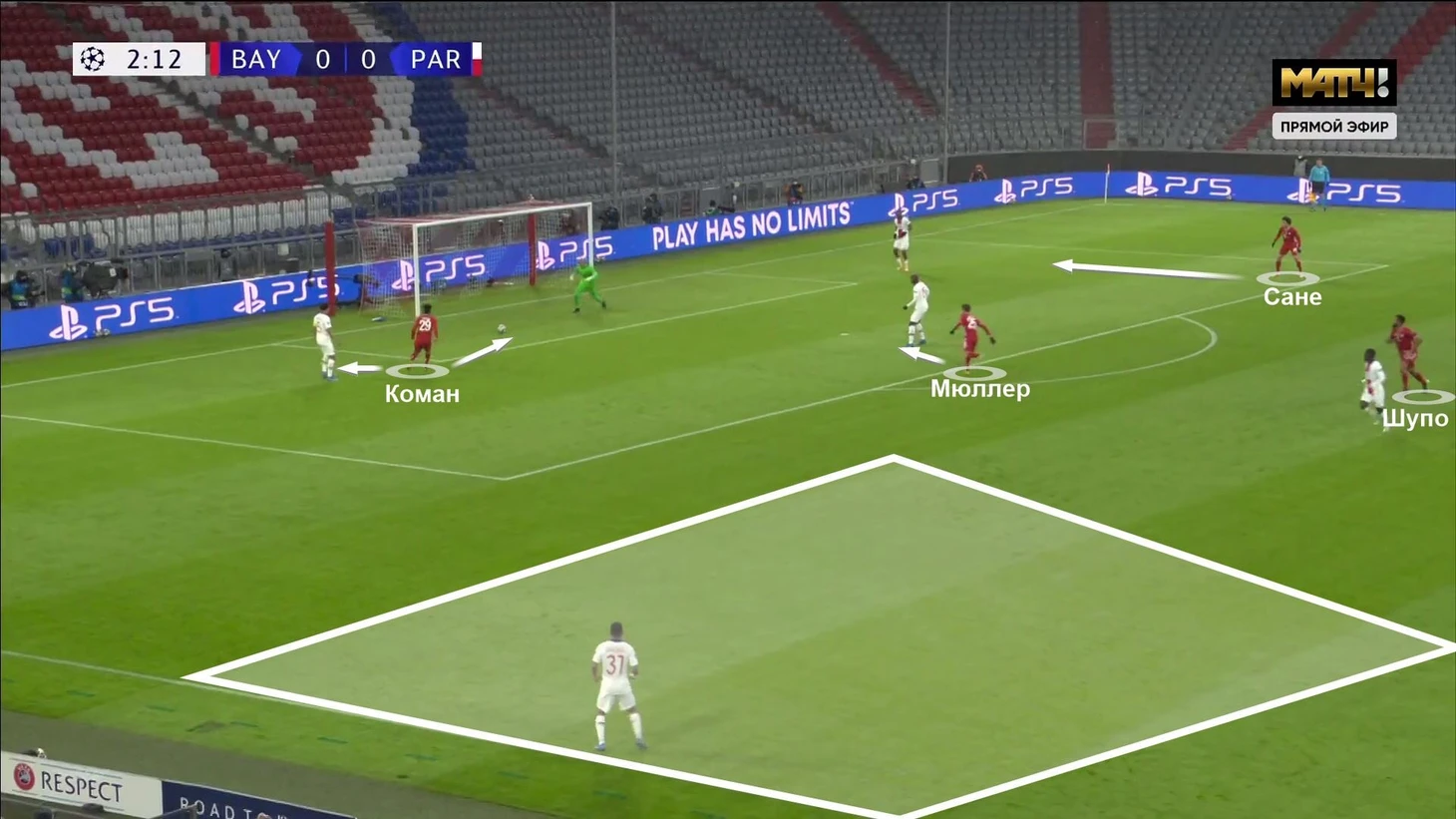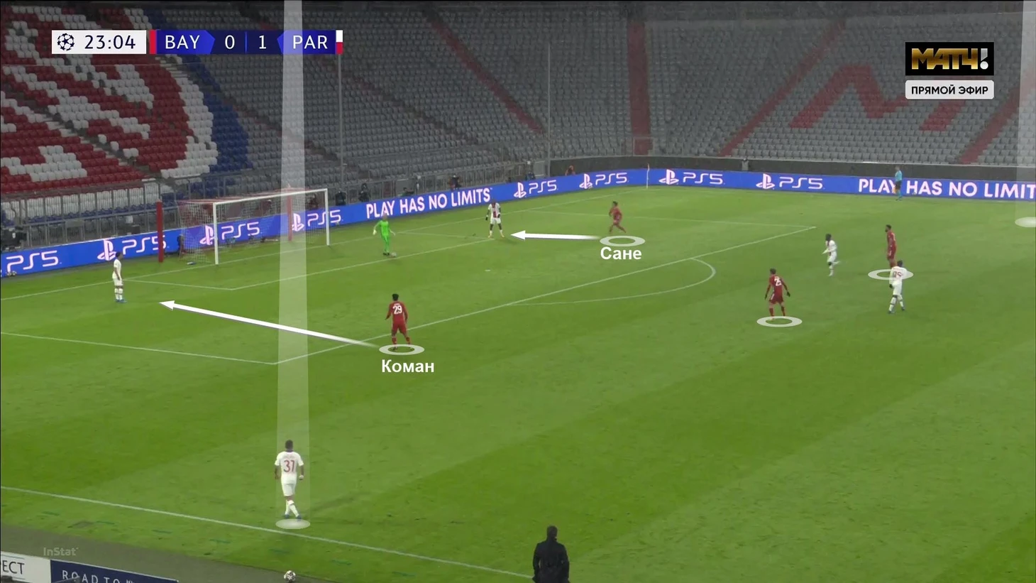 Гол родился из прессинга «Баварии». По традиции команда Флика максимально уплотняла центр и оставляла фланги свободными. Сане и Коман выдвигались на центральных защитников: