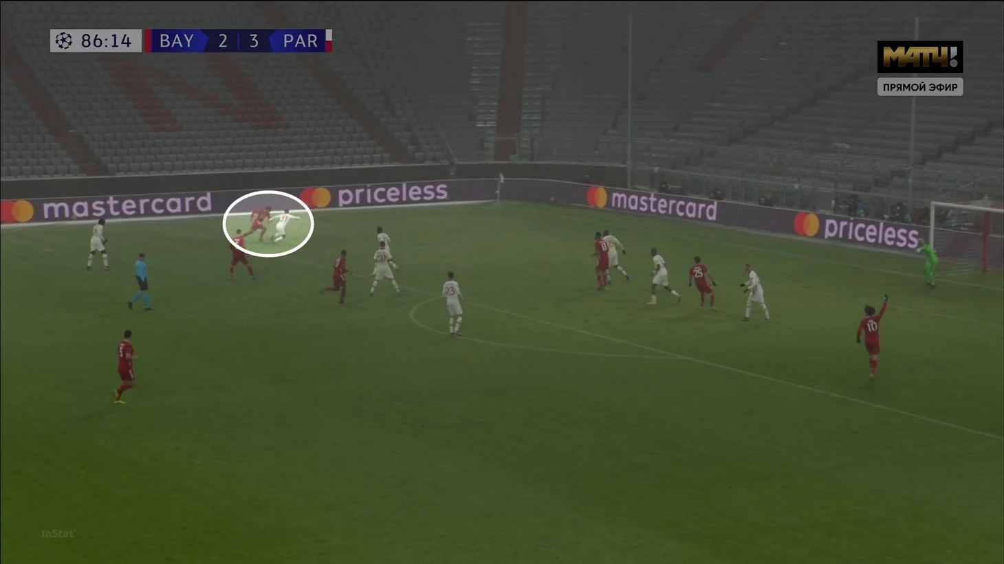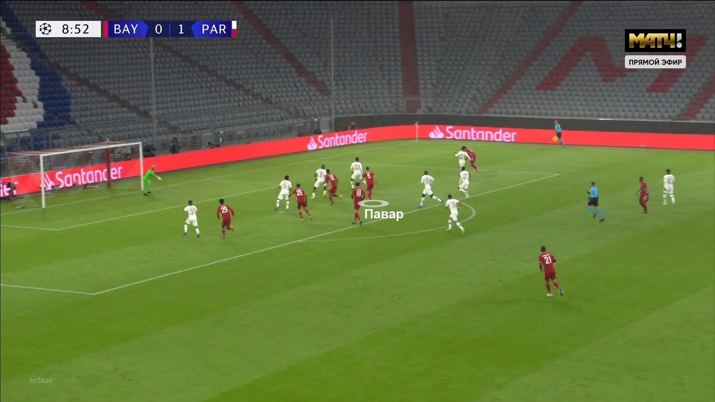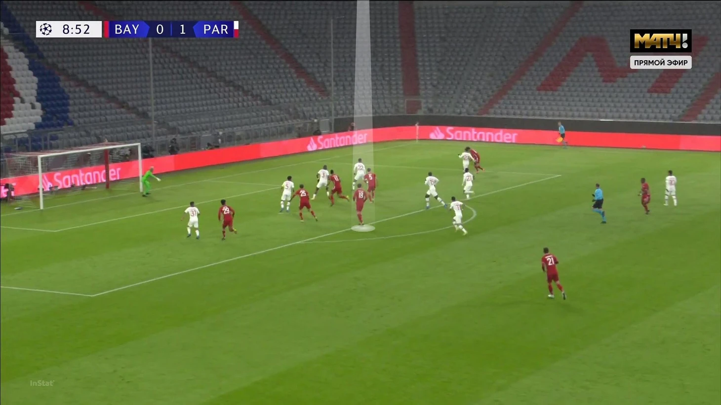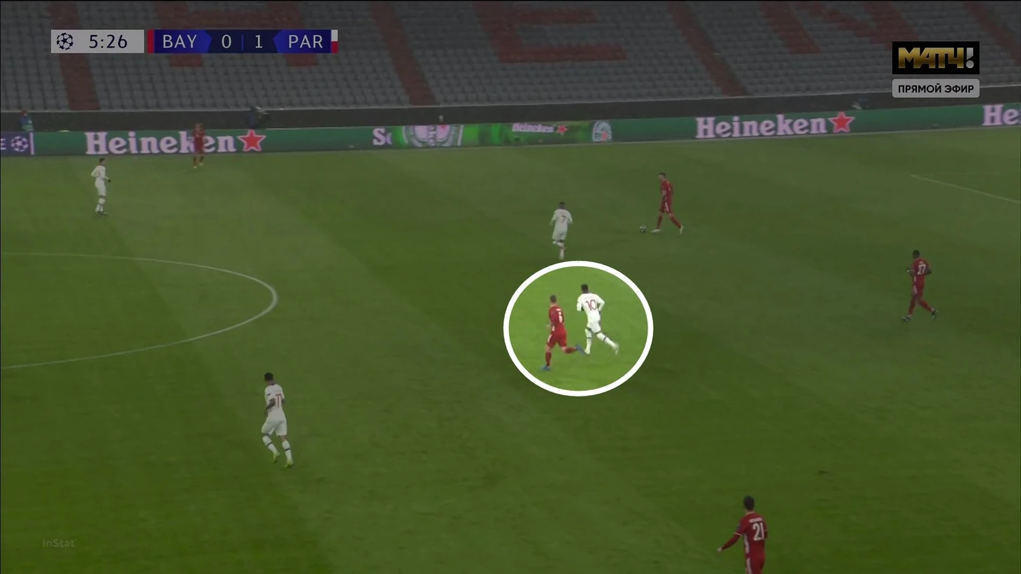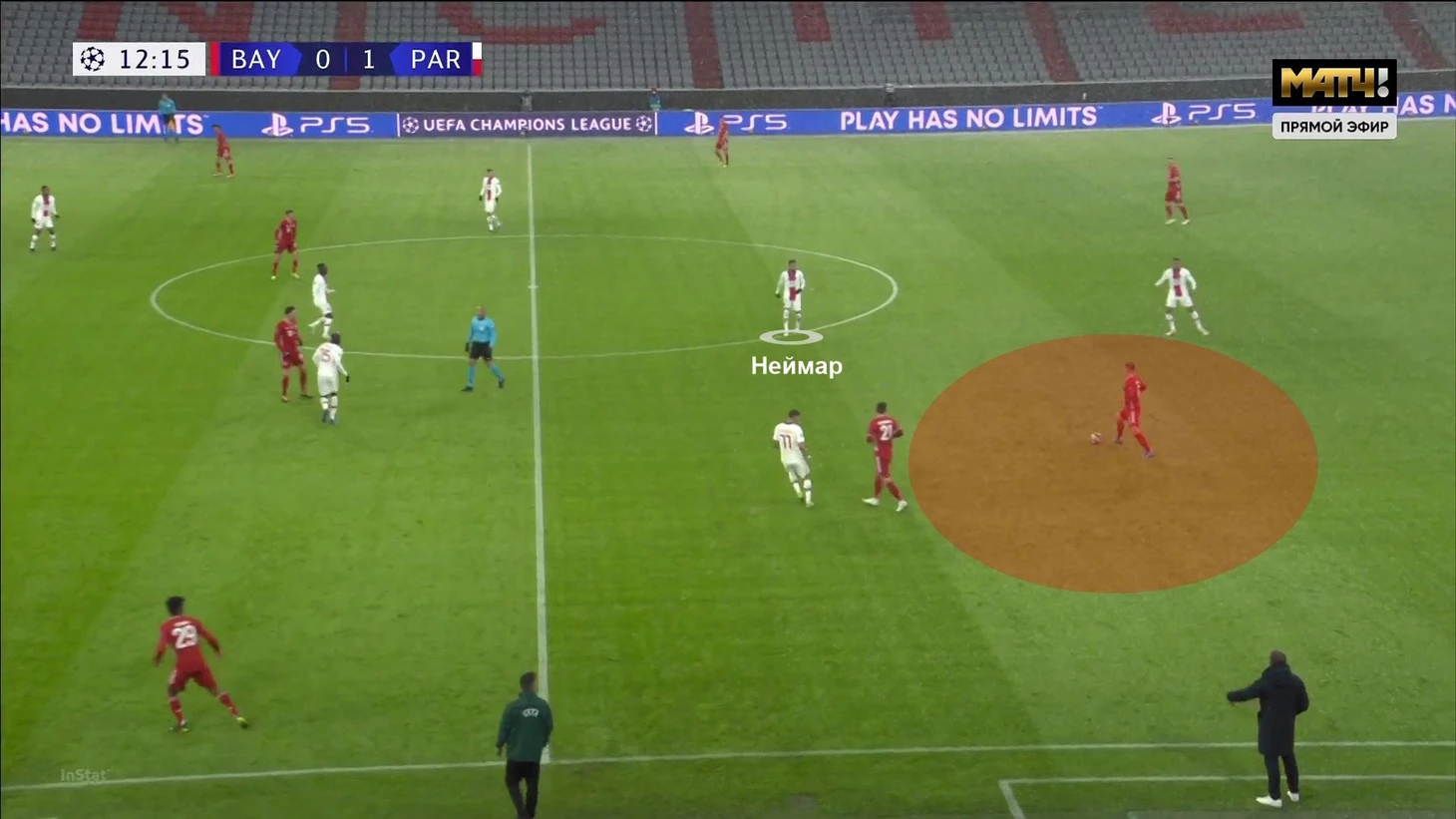 8. Но в атаках «ПСЖ» на скорости доминировал уже Неймар. Во-первых, помогала та самая более свободная позиция. Во-вторых, Киммих часто действовал слишком агрессивно – выбрасывался, не оценивая ситуацию у себя за спиной. Часто этот недостаток не могут использовать против Йозуа, но Неймар – топ-исполнитель.