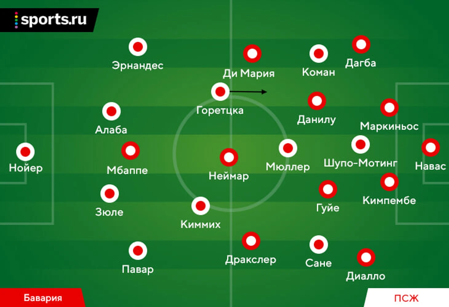 1. Главная интрига у «Баварии» сводилась к замене Роберта Левандовского. На позицию претендовали Серж Гнабри (как ложная девятка) и Эрик Шупо-Мотинг, но из-за положительного теста Гнабри на коронавирус Ханси Флику даже не пришлось выбирать.