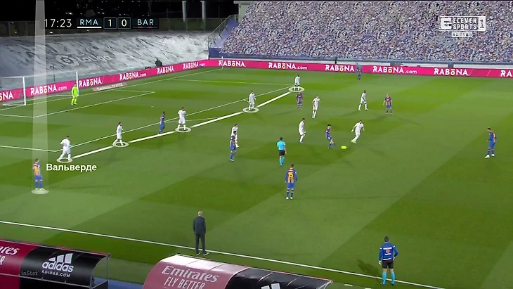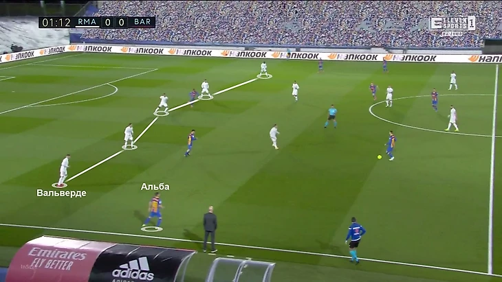 В этот раз Зидан наградил невероятно объемной ролью Вальверде. Он был на первых ролях в прессинге, но как только эпизод переходил в позиционную атаку «Барсы», быстро и дисциплинированно садился за Альбой. Поймать «Реал» можно было только в момент этого перехода (один раз в первом тайме получилось).