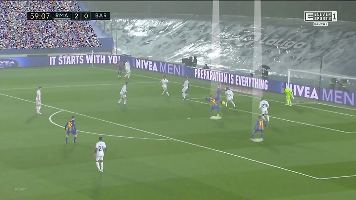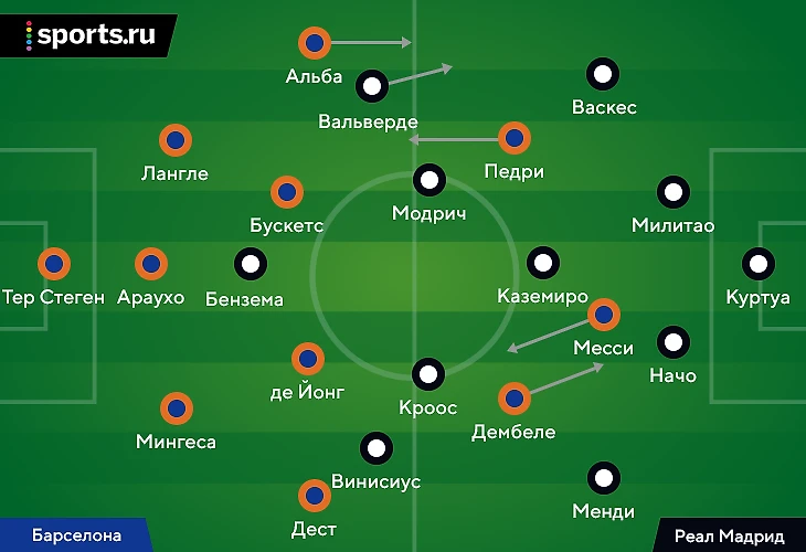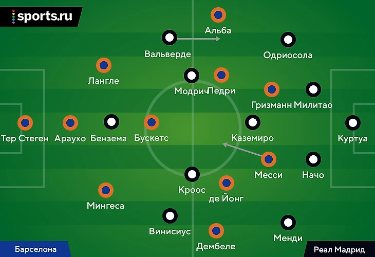 10. «Барса» начала тайм с острейшего удара Гризманна (из легкого офсайда) как раз после атаки через высокую позицию Дембеле и с участием Мингесы. Они нагрузили фланговых Винисиуса и Менди, Кроос и Начо запутались, кто играет против Френки: