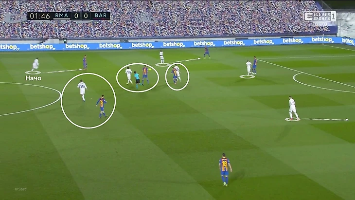 Зидан проявил тонкое мышление и гибкость. Вероятный мотив – схема «Барселоны», которая практически идеально накладывается на привычные 4-3-3 «Мадрида» при персональном прессинге. В рамках этой структуры прессинга «Реал» был хорош и давил цельно. Даже Начо шел до упора с Месси, если тот опускался в глубину (но шел только в стадии прессинга):