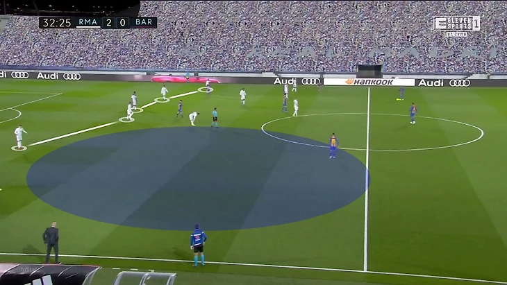 Никто из футболистов «Барсы» не держал позицию в этой зоне. Игроки смещались туда, только когда там оказывался мяч (но тогда смещались и футболисты «Реала»). При лучшей структуре и заполнении этой зоны «Барса» получила бы: 1) больше свободы в зоне Месси (если бы «Реал» реагировал на заполнение левого края); 2) перманентно свободного игрока в опорной зоне соперника (если бы «Реал» не реагировал на заполнение).