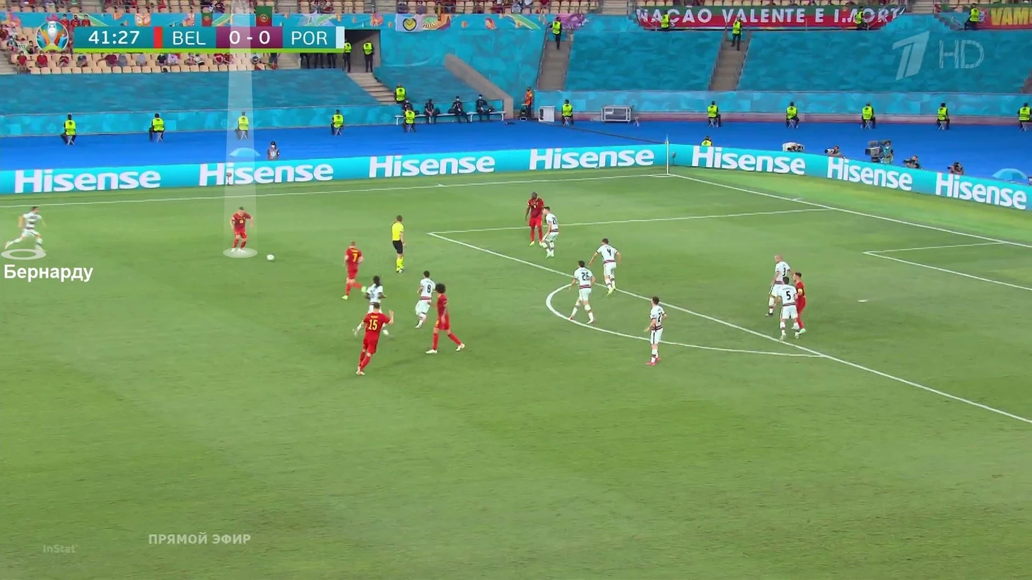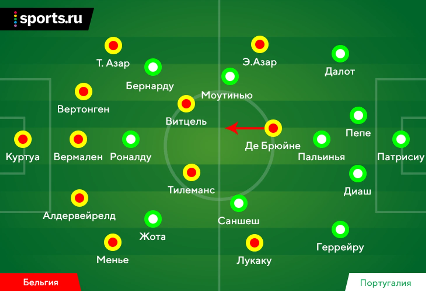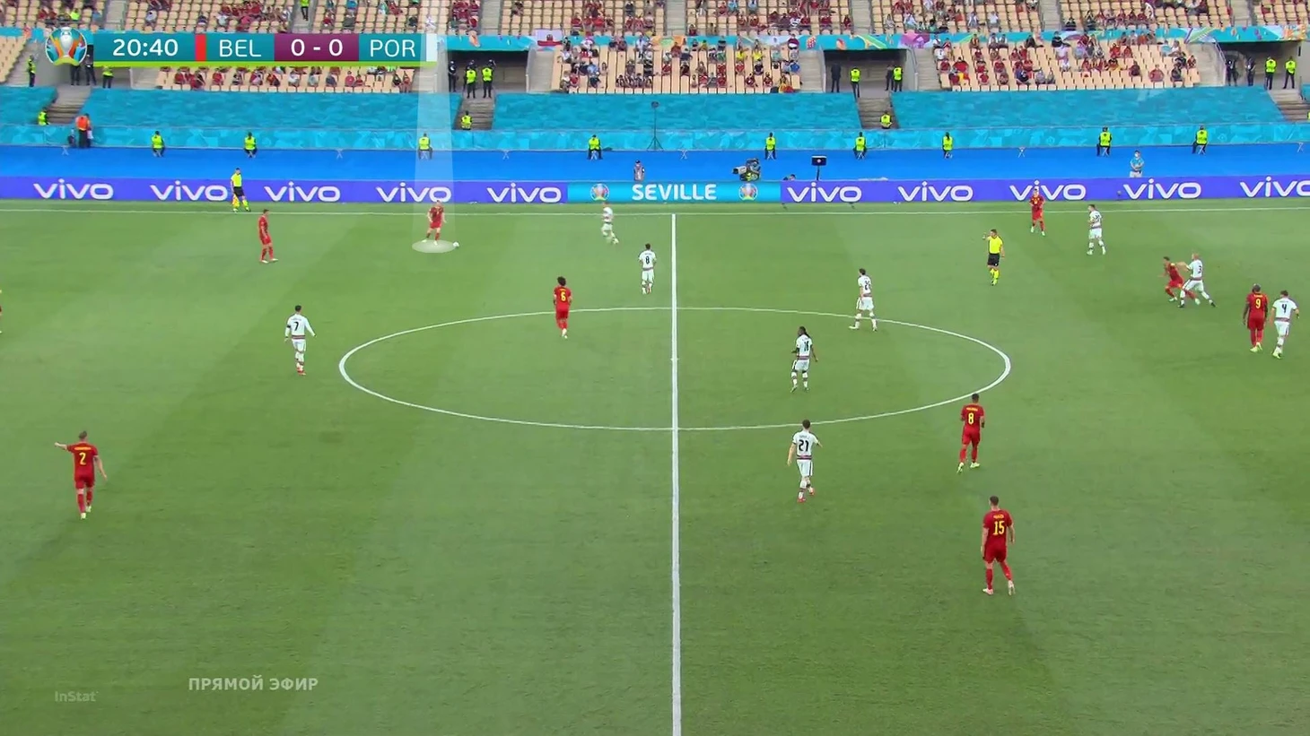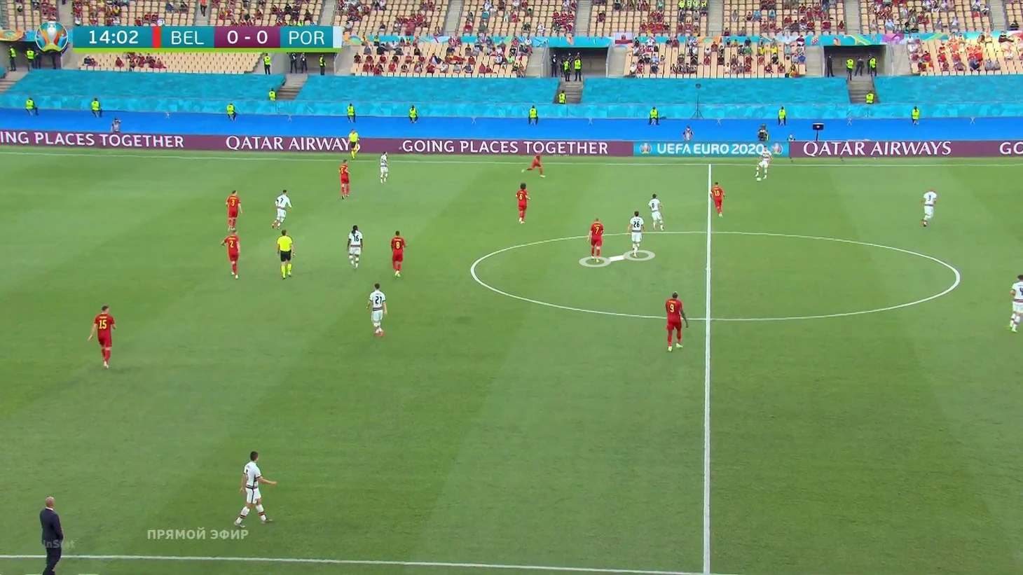 Первый тайм: обе команды играют без позиционной атаки и практически без прессинга. Дают друг другу владеть мячом, но матч проходит почти без шансов. Пассивность Бельгии и готовность отдавать мяч Португалии стала сюрпризом, но на этом этапе ход Мартинеса не был проблемой.